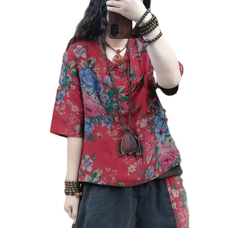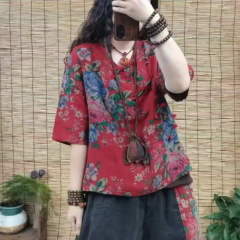 衣都精品- 2023新款V領斜襟盤扣拼接五分袖上衣