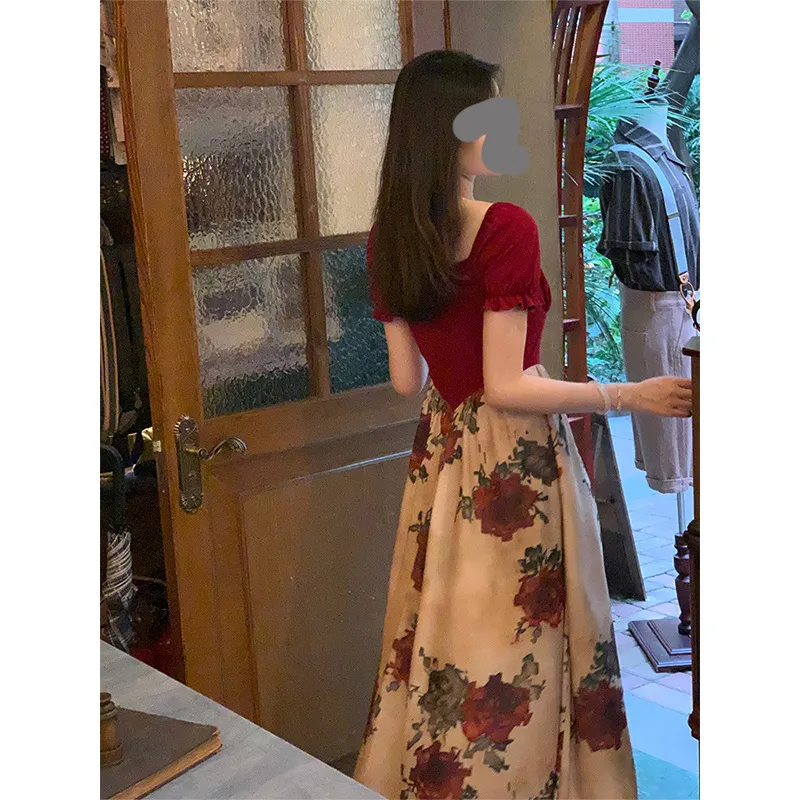 衣都精品- 2023新款流蘇盤扣繡花甜美泡泡袖短袖上衣+半身裙套裝