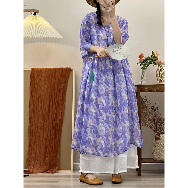 衣都精品- 2023新款溫柔風印花木耳袖仿真絲連衣裙