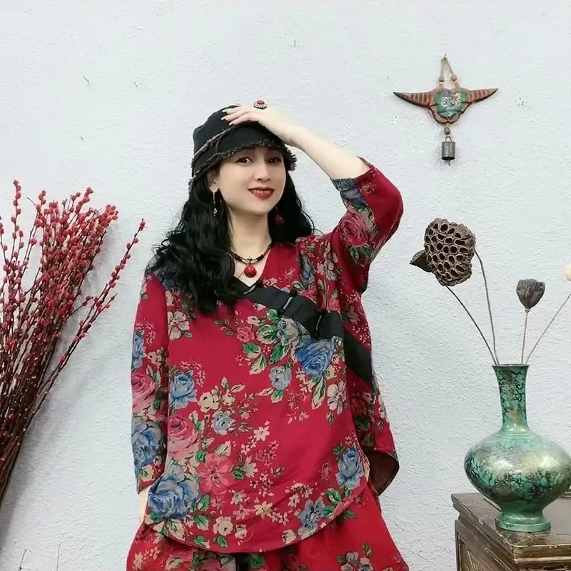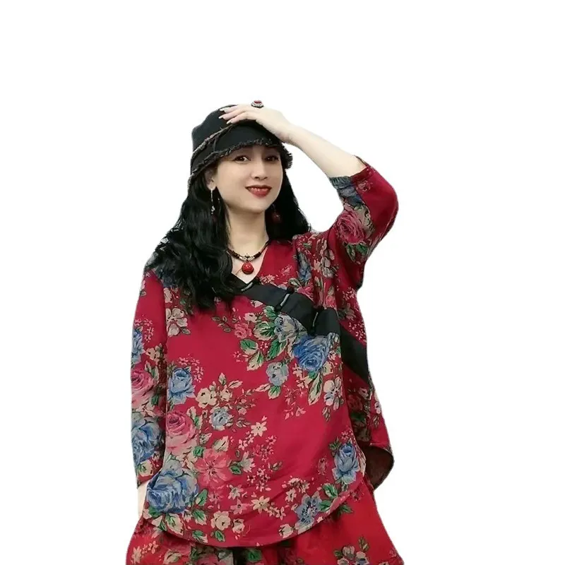 衣都精品- 2023新款V領斜襟盤扣拼接七分袖上衣