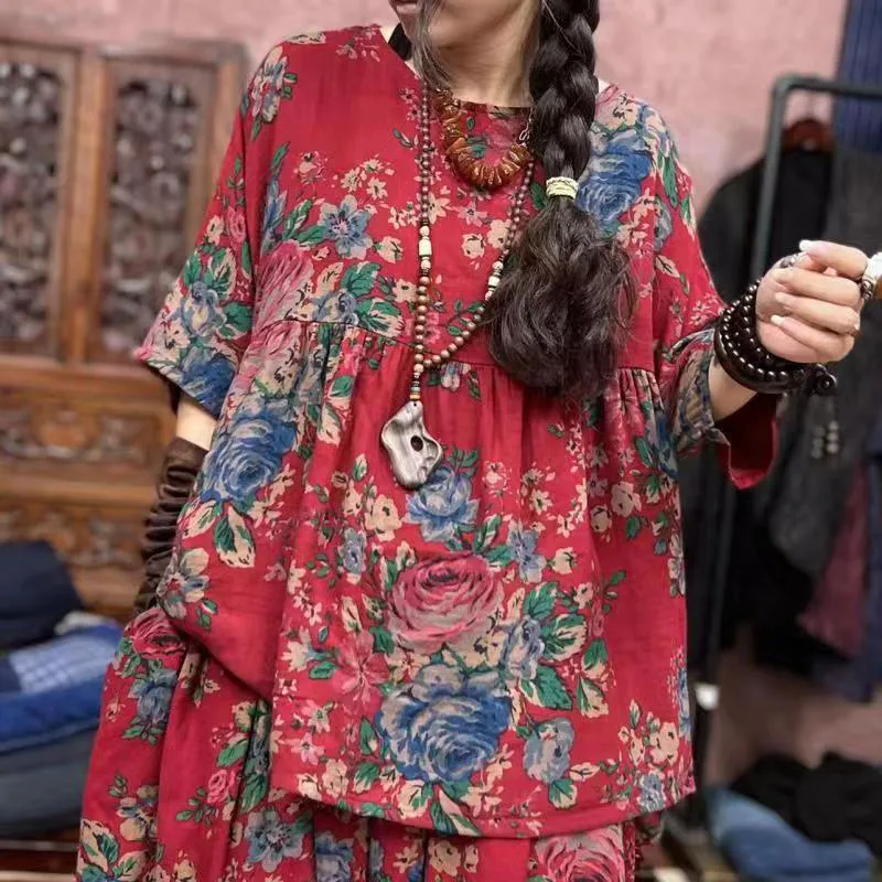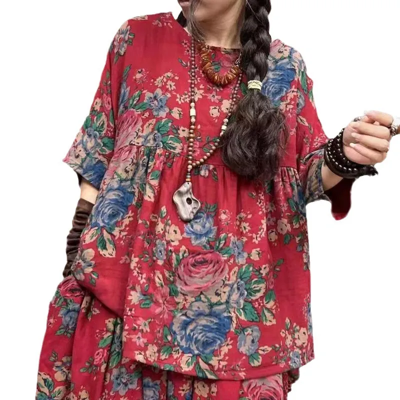 衣都精品- 2023新款東北大花圓領套頭寬鬆五分袖上衣