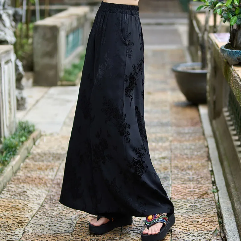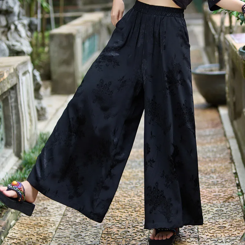 衣都精品- 2023新款民族風緞面提花鬆緊腰闊腿褲