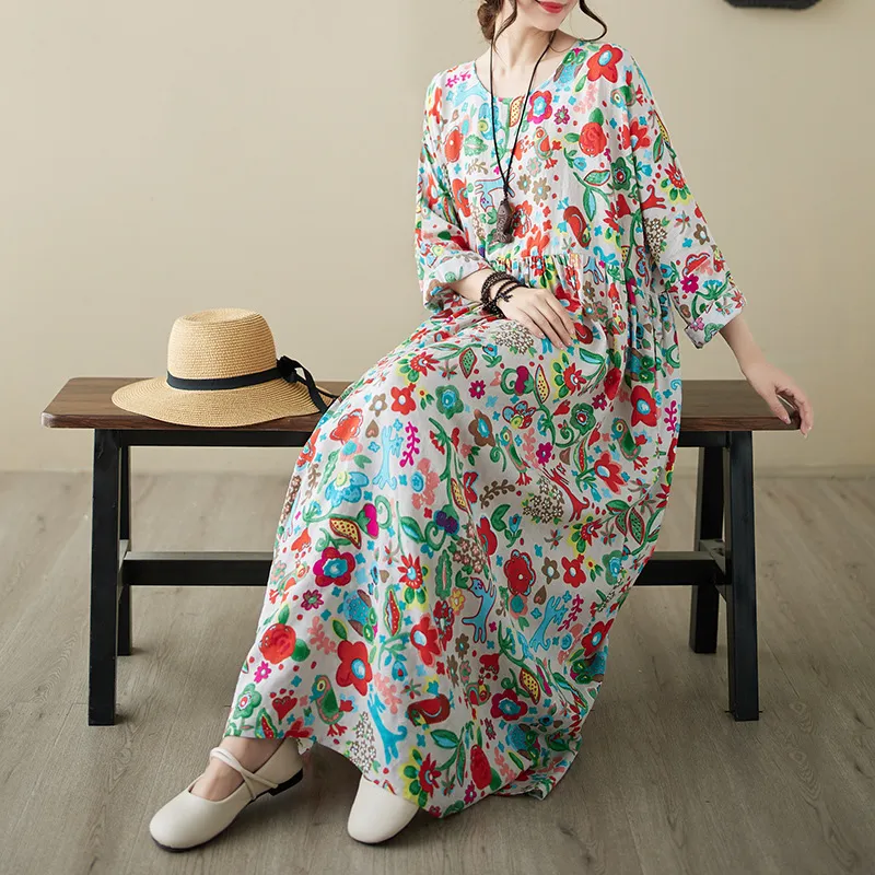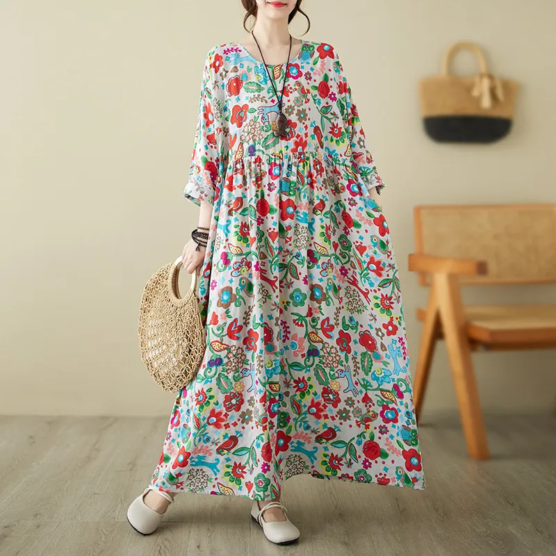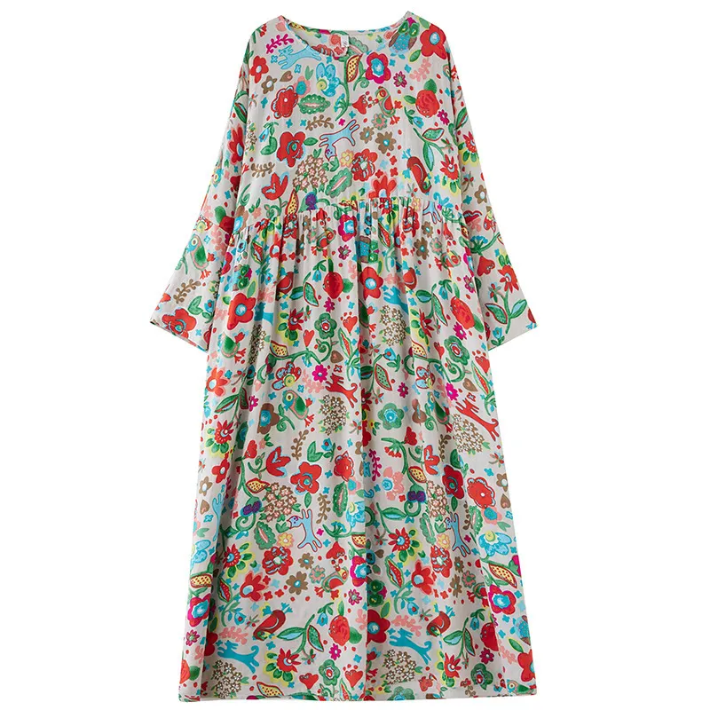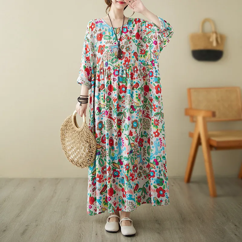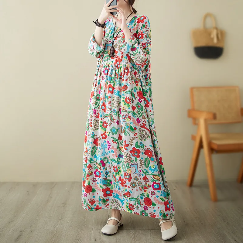 衣都精品- 2023新款大碼圓領印花長袖遮肚連衣裙
