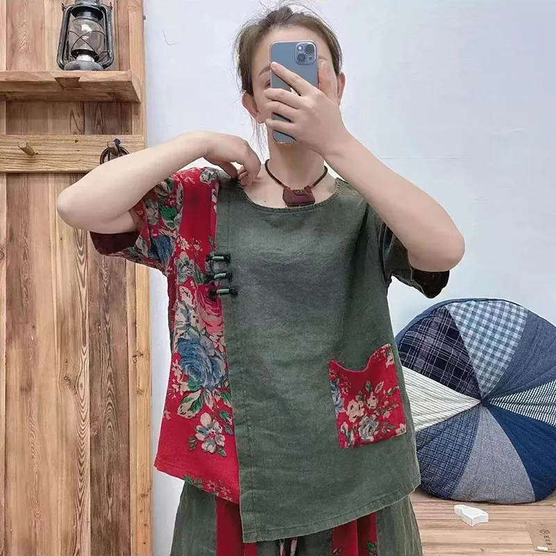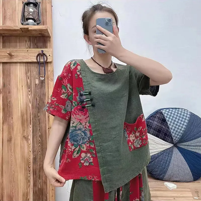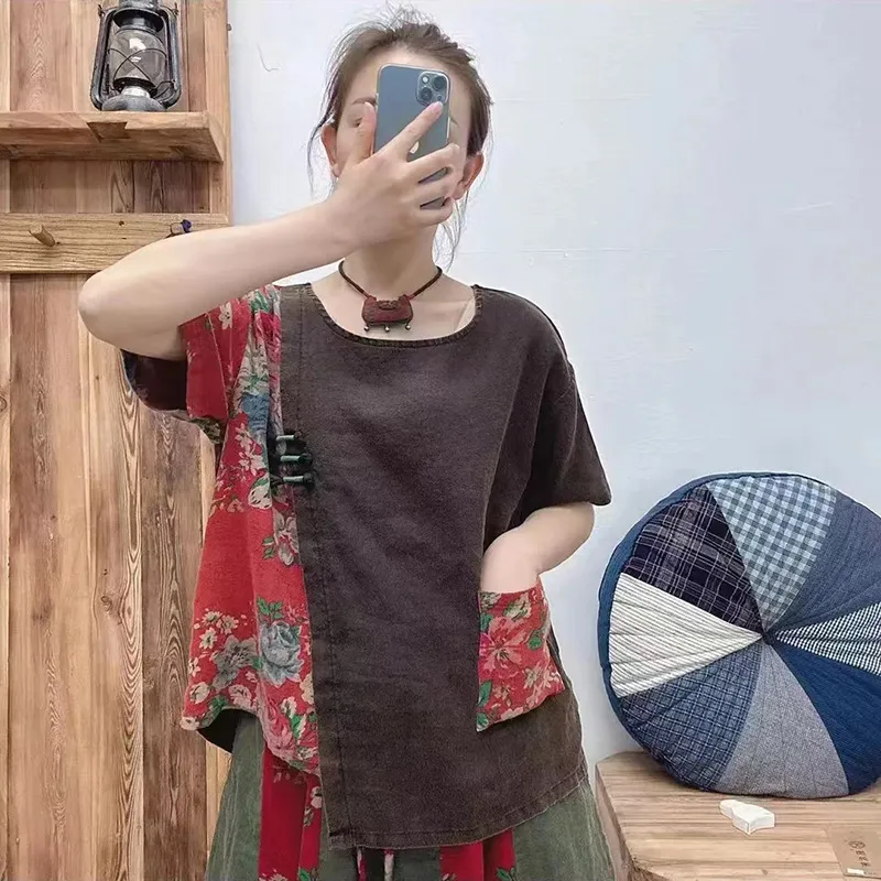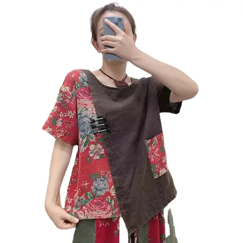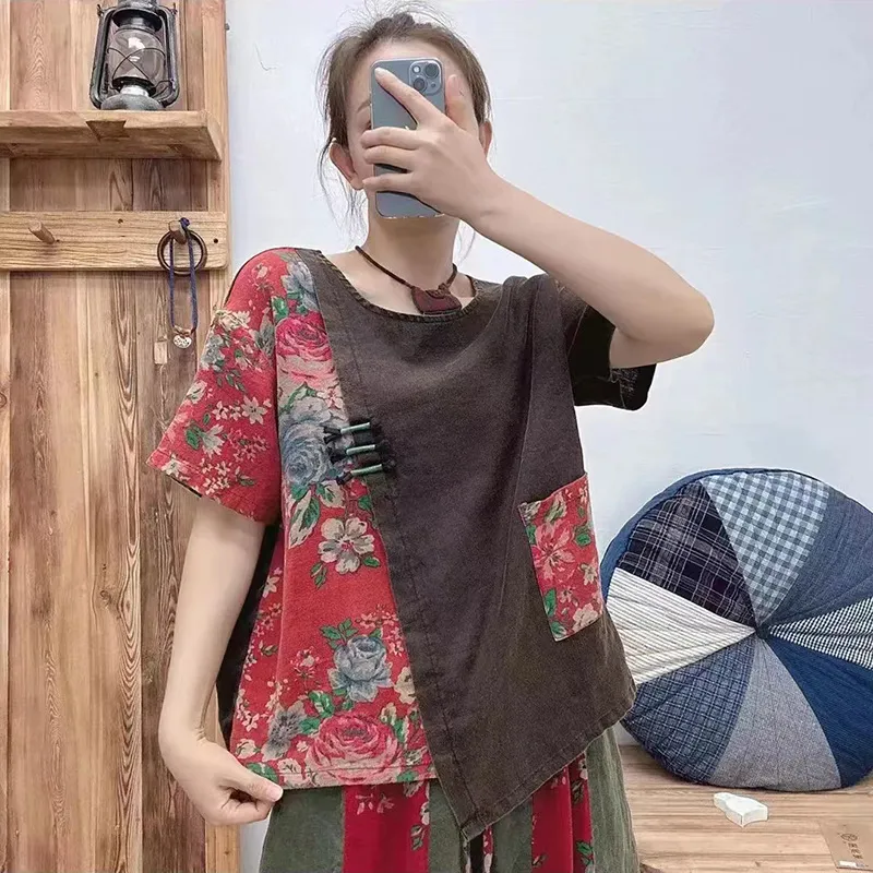 衣都精品- 2023新款圓領套頭東北大花拼接短袖上衣