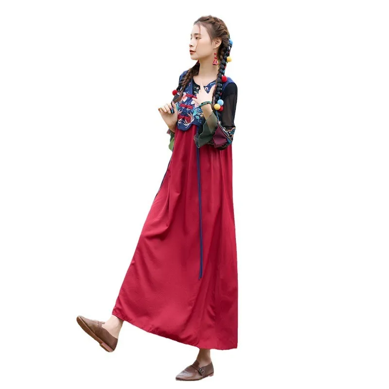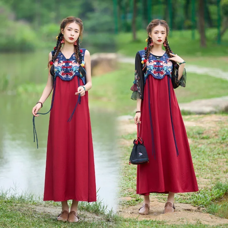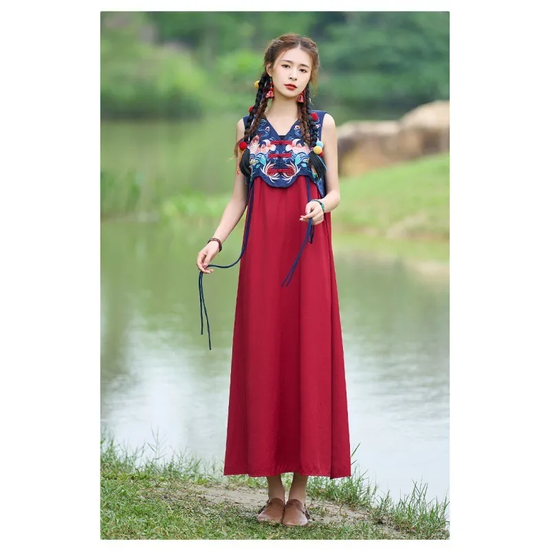 衣都精品- 2023新款復古V領盤扣拼色刺繡寬鬆無袖連衣裙