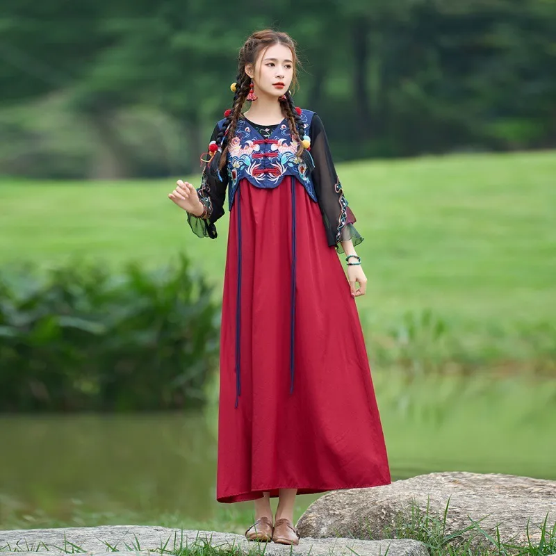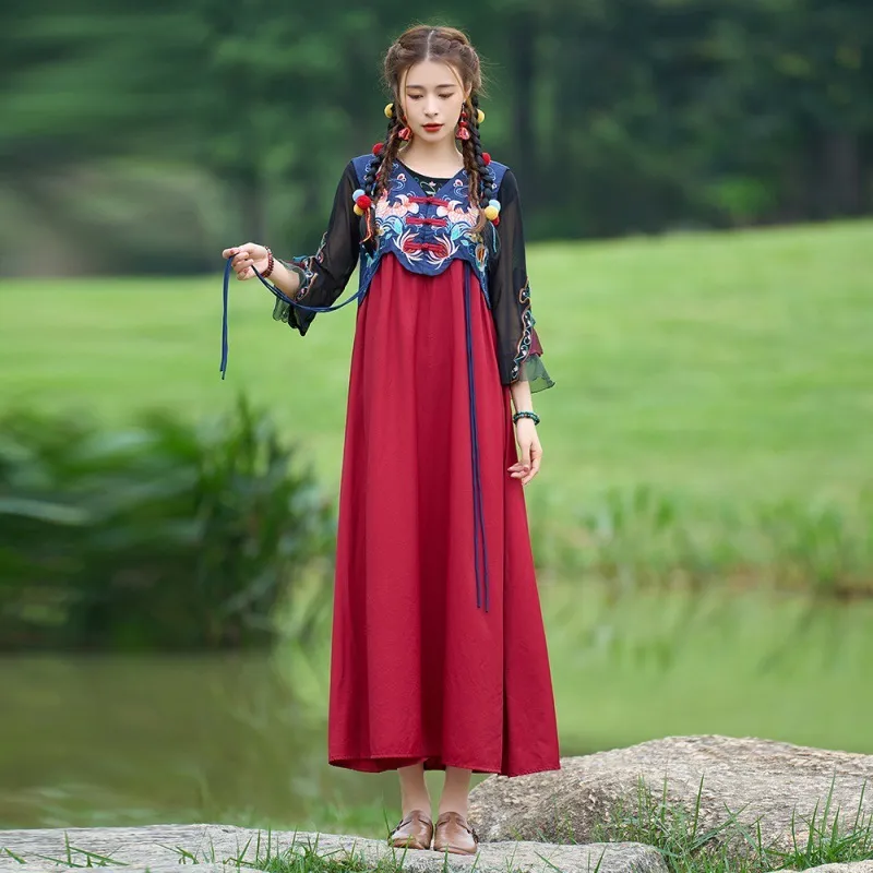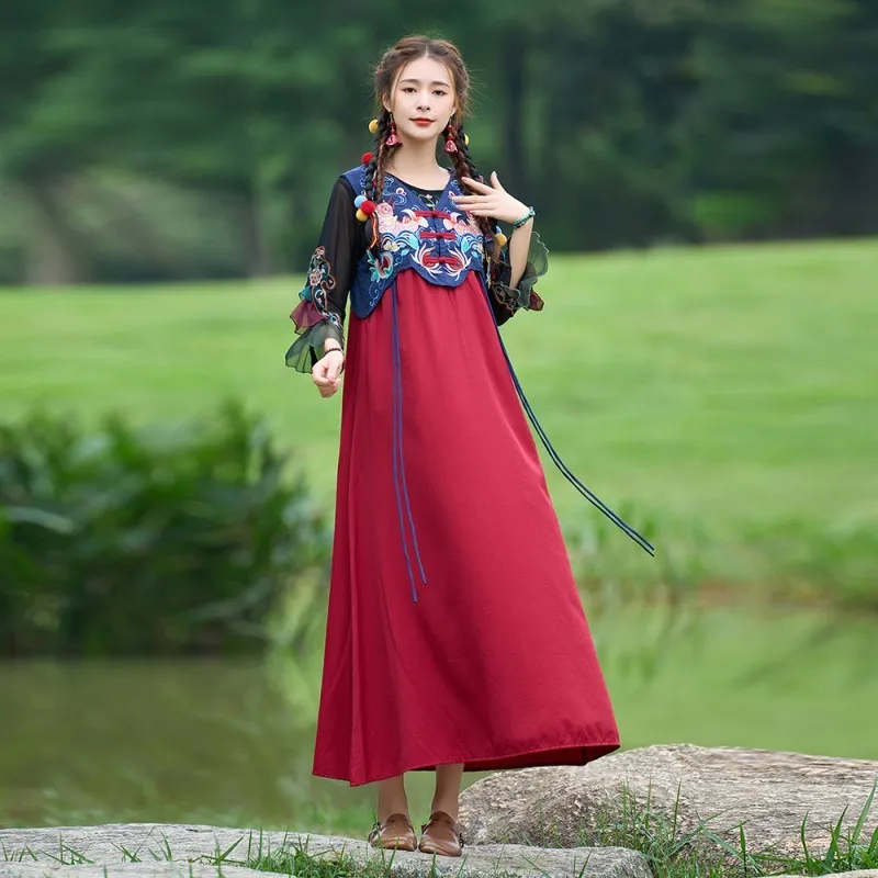 衣都精品- 2023新款復古盤扣拼色繡花無袖馬甲連衣裙