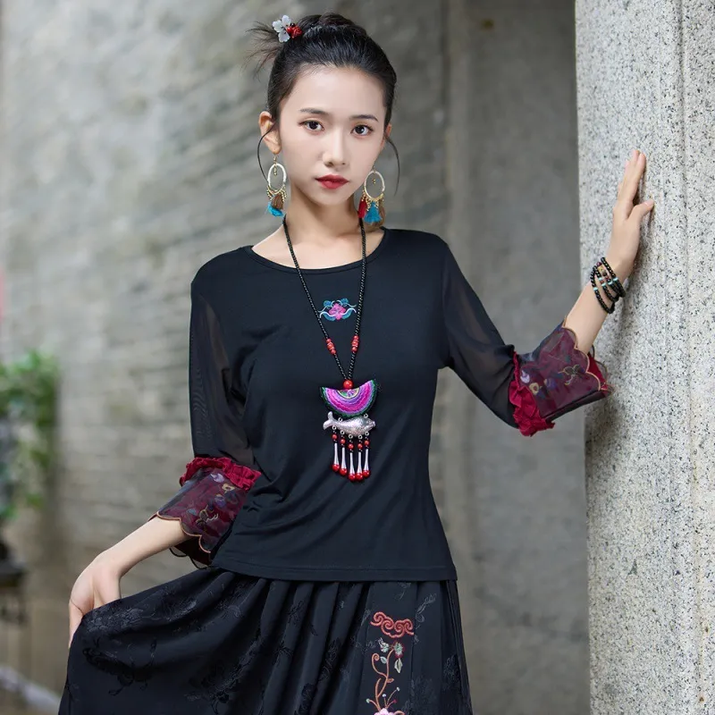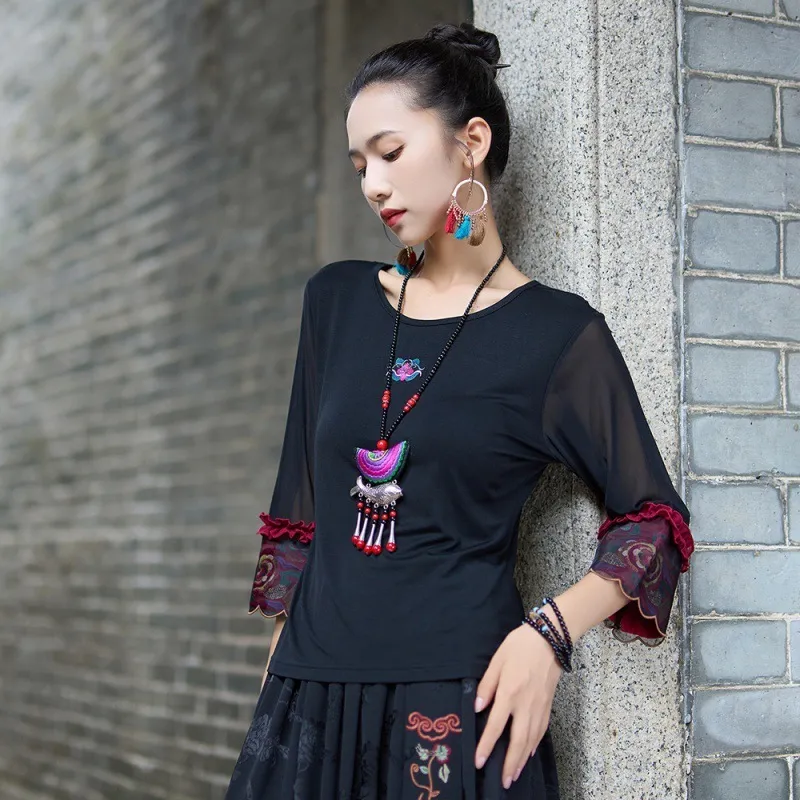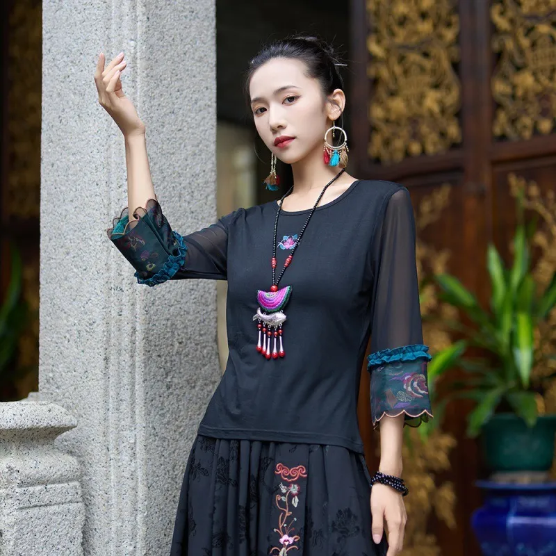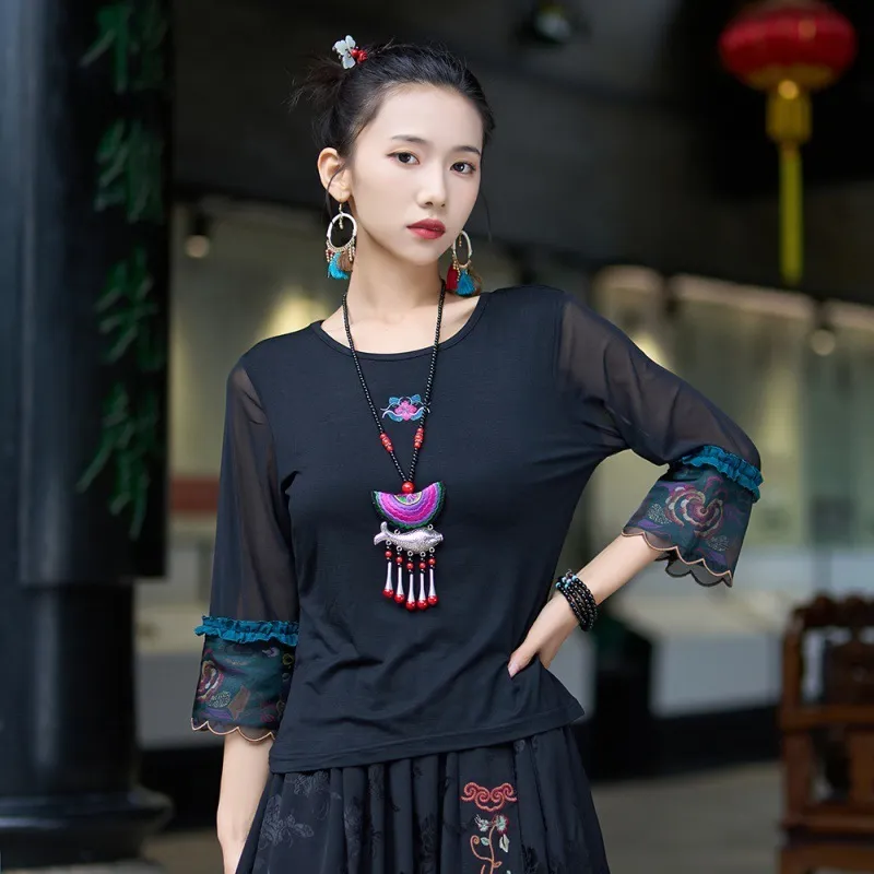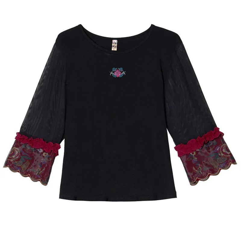 衣都精品- 2023新款民族風繡花網紗七分袖上衣