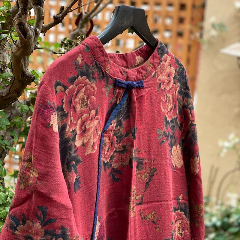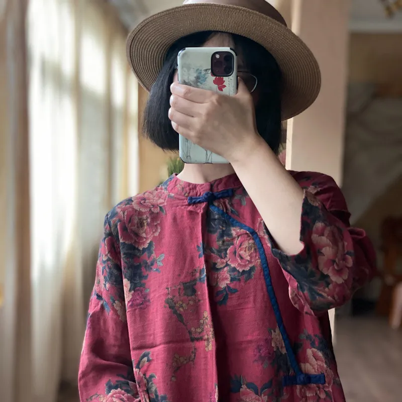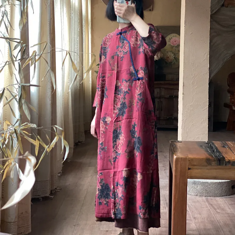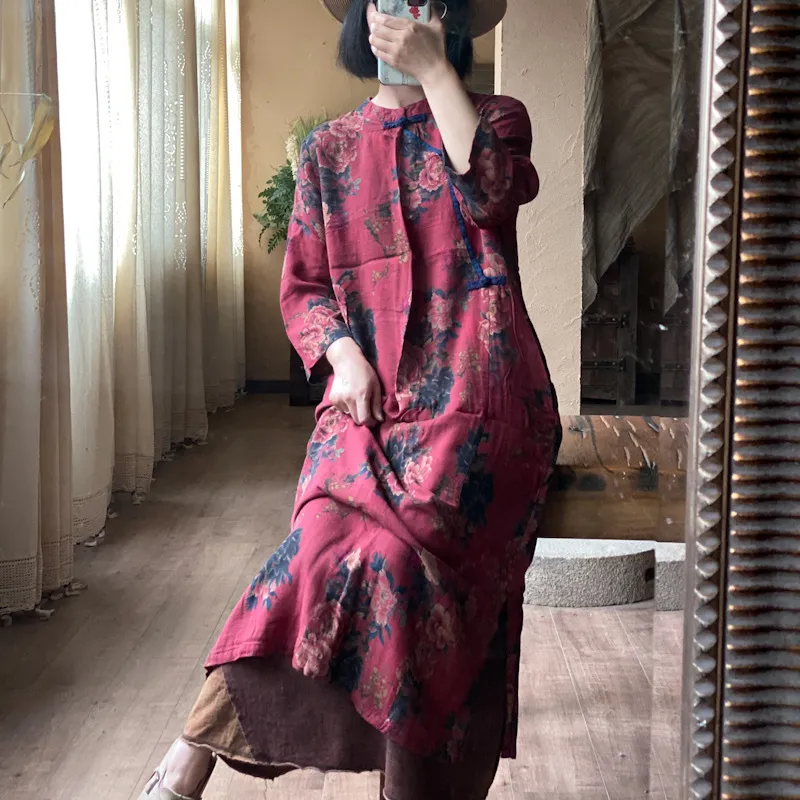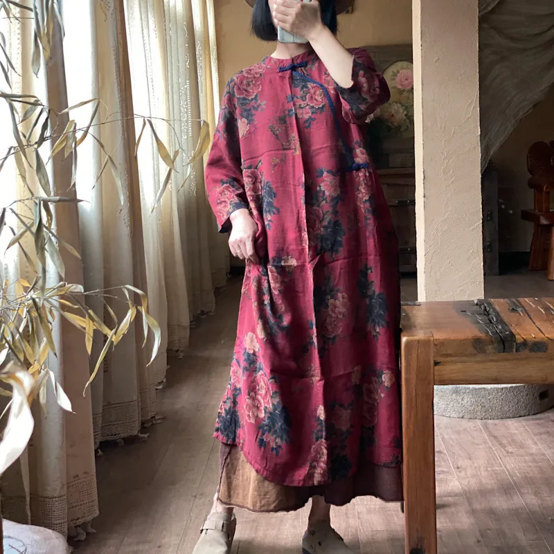衣都精品- 2023新款復古舊感雙層棉紗寬鬆盤扣連衣裙