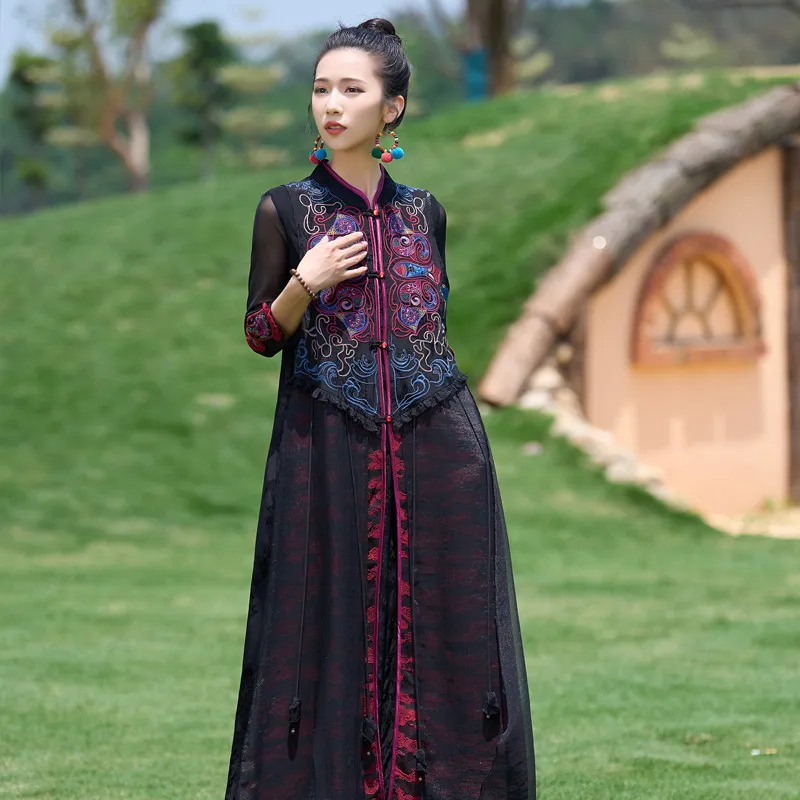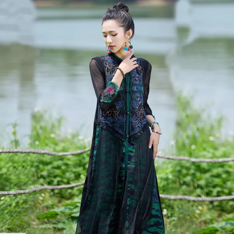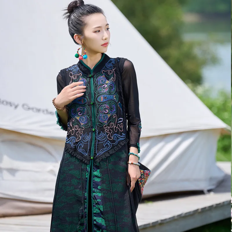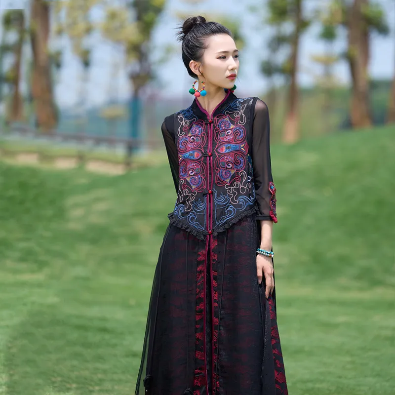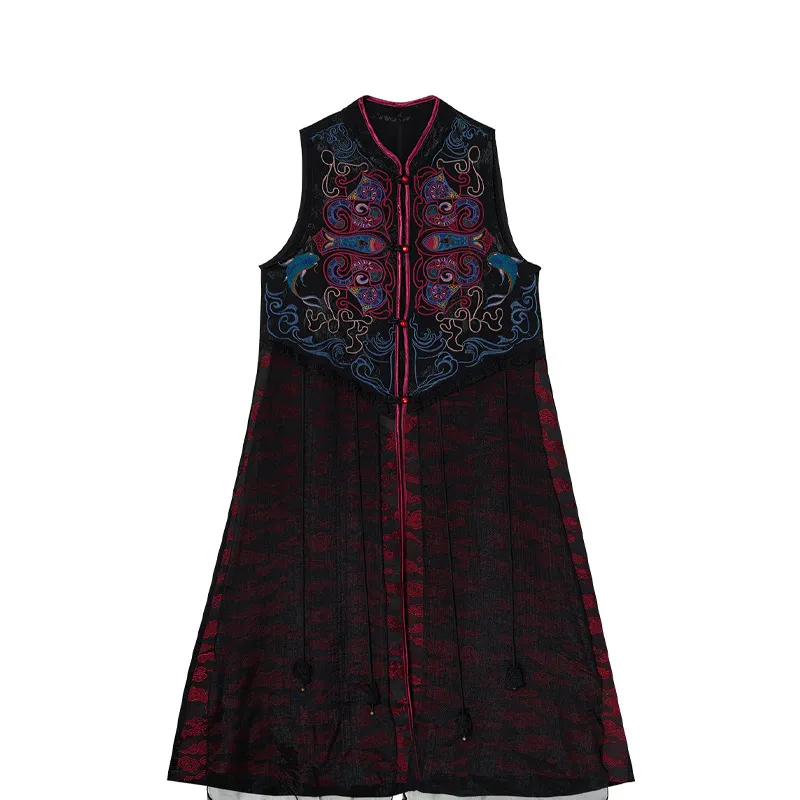 衣都精品- 2023新款民族風重工刺繡馬甲緞面連衣裙