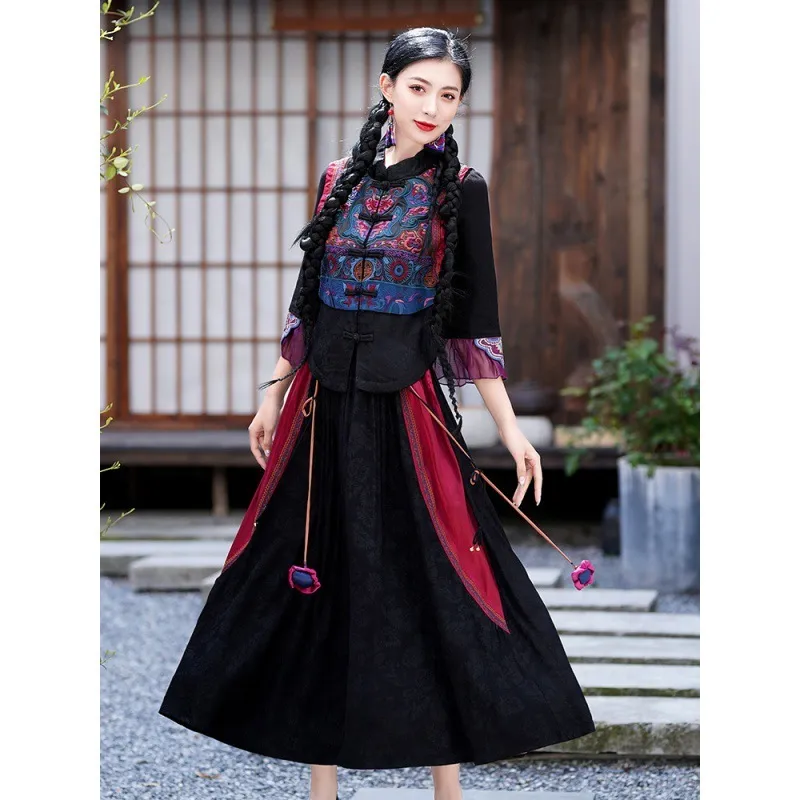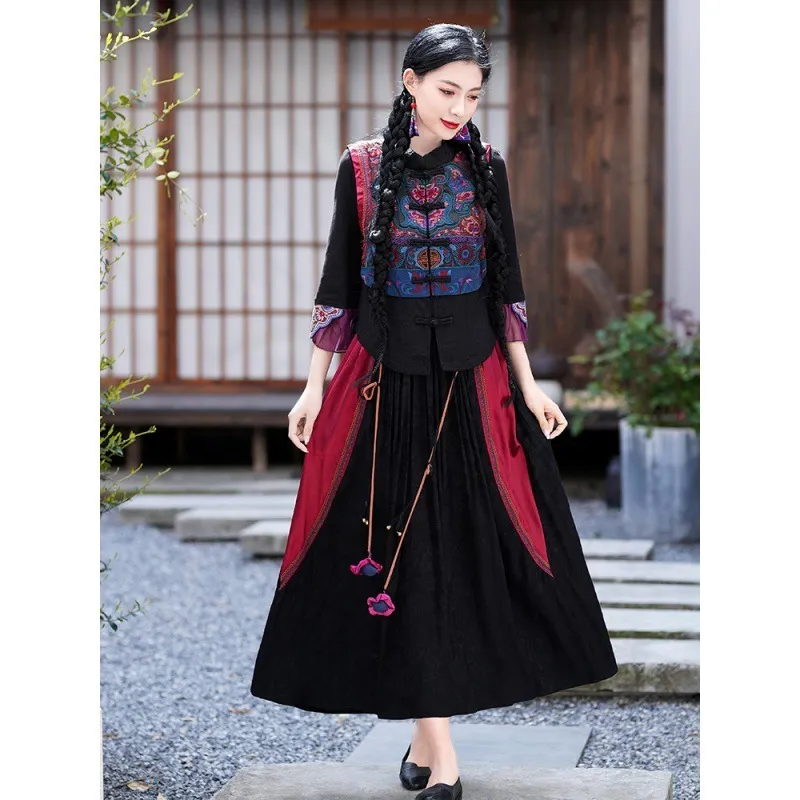 衣都精品- 2023新款民族風重工刺繡馬甲緞面連衣裙
