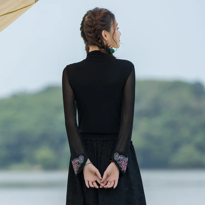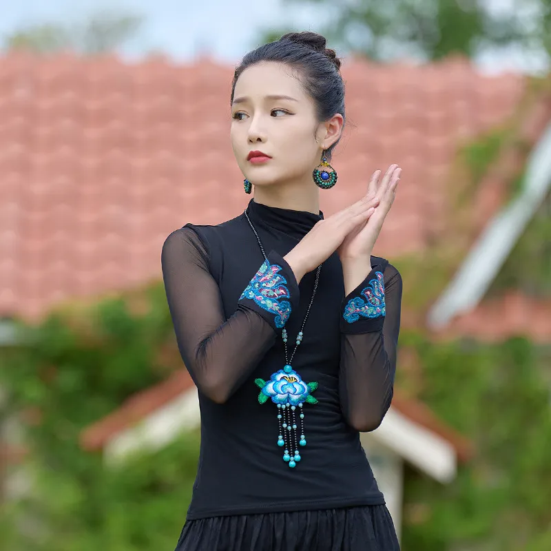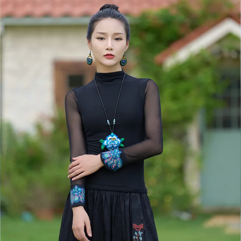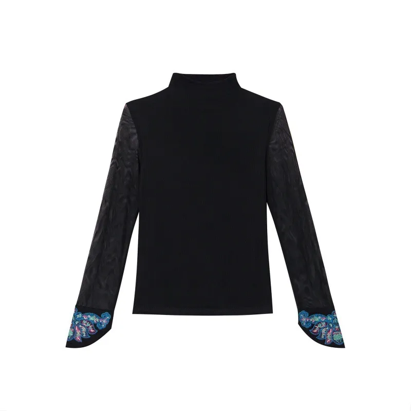 衣都精品- 2023新款民族風網紗繡花半高領百搭顯瘦上衣