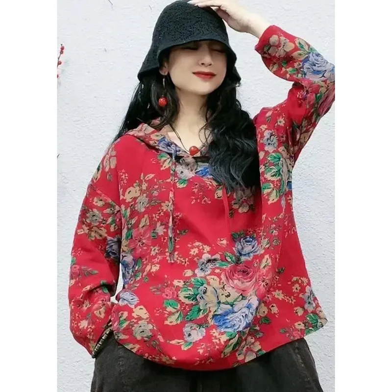 衣都精品- 2023新款復古東北大花寬鬆休閒連帽套頭上衣