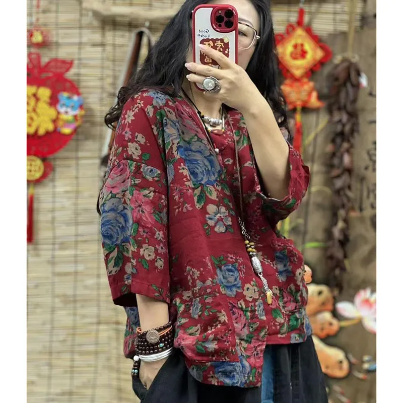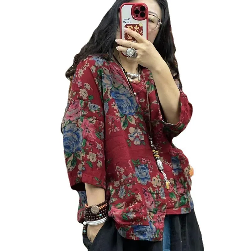 衣都精品- 2023新款復古東北大花圓領套頭七分袖上衣