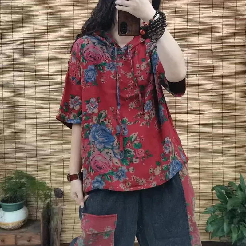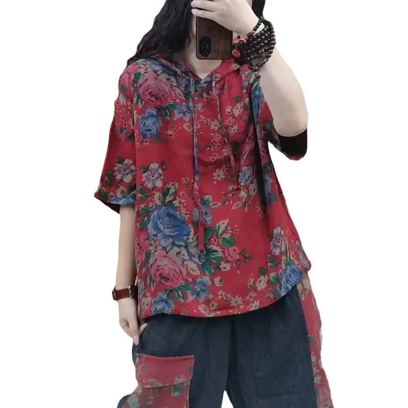 衣都精品- 2023新款復古東北大花寬鬆休閒連帽套頭上衣