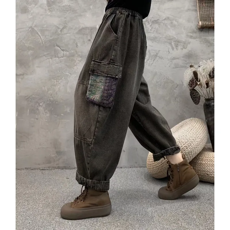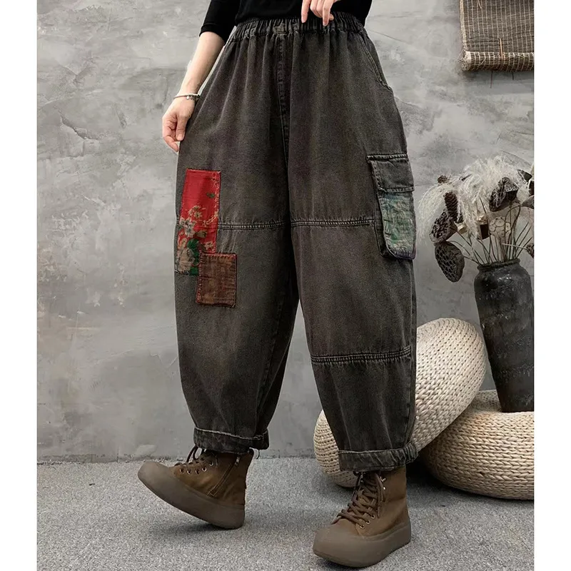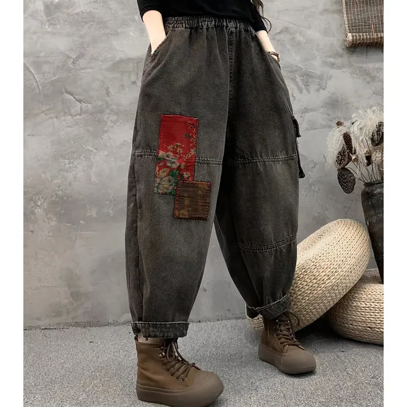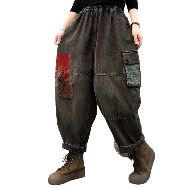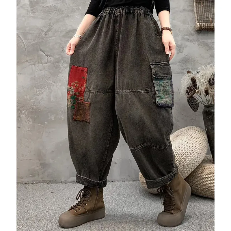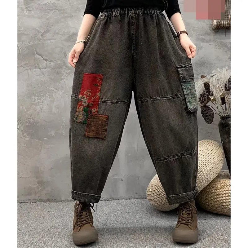 衣都精品- 2023新款貼布刺繡鬆緊腰大碼顯瘦哈倫褲