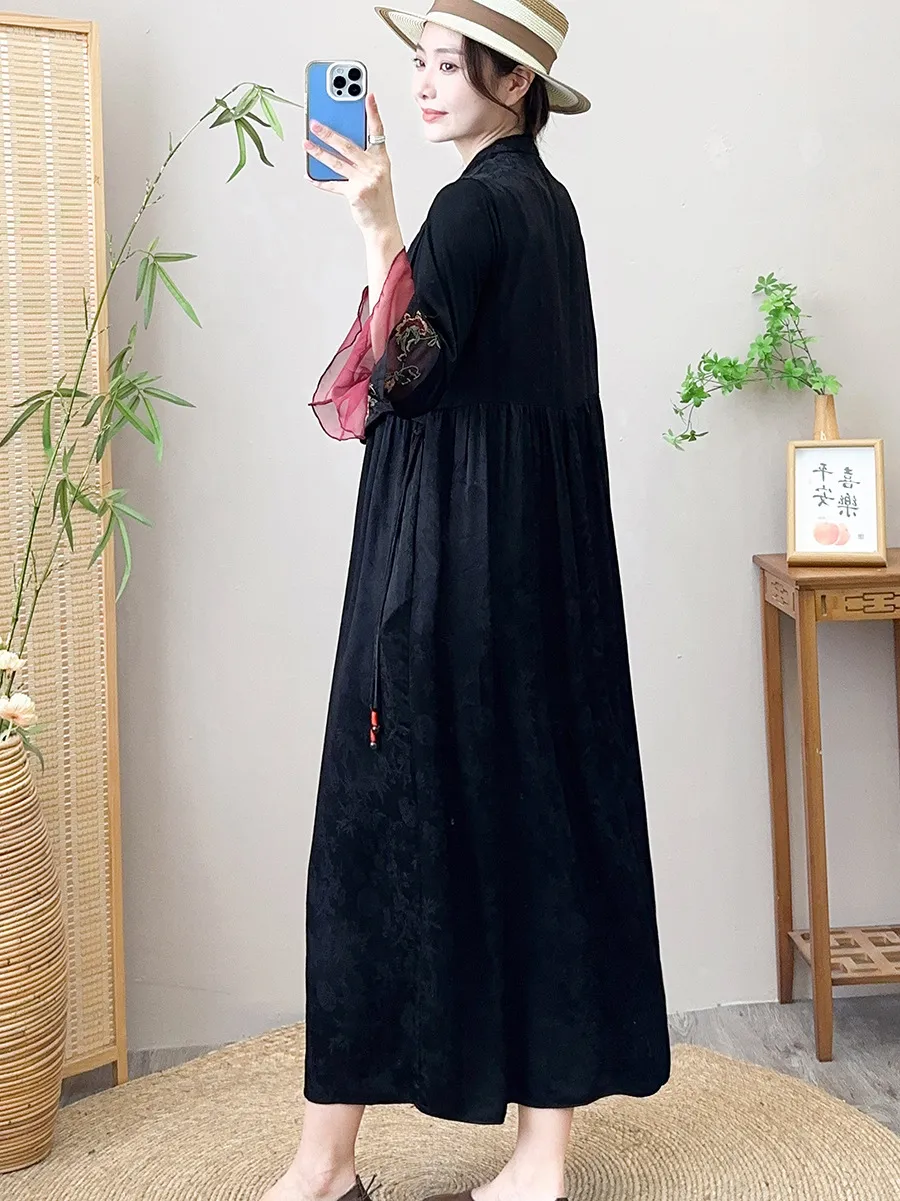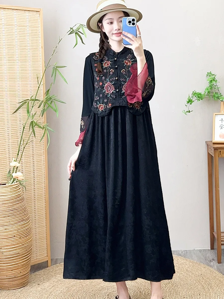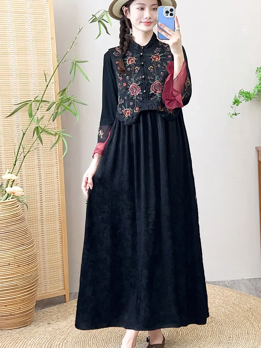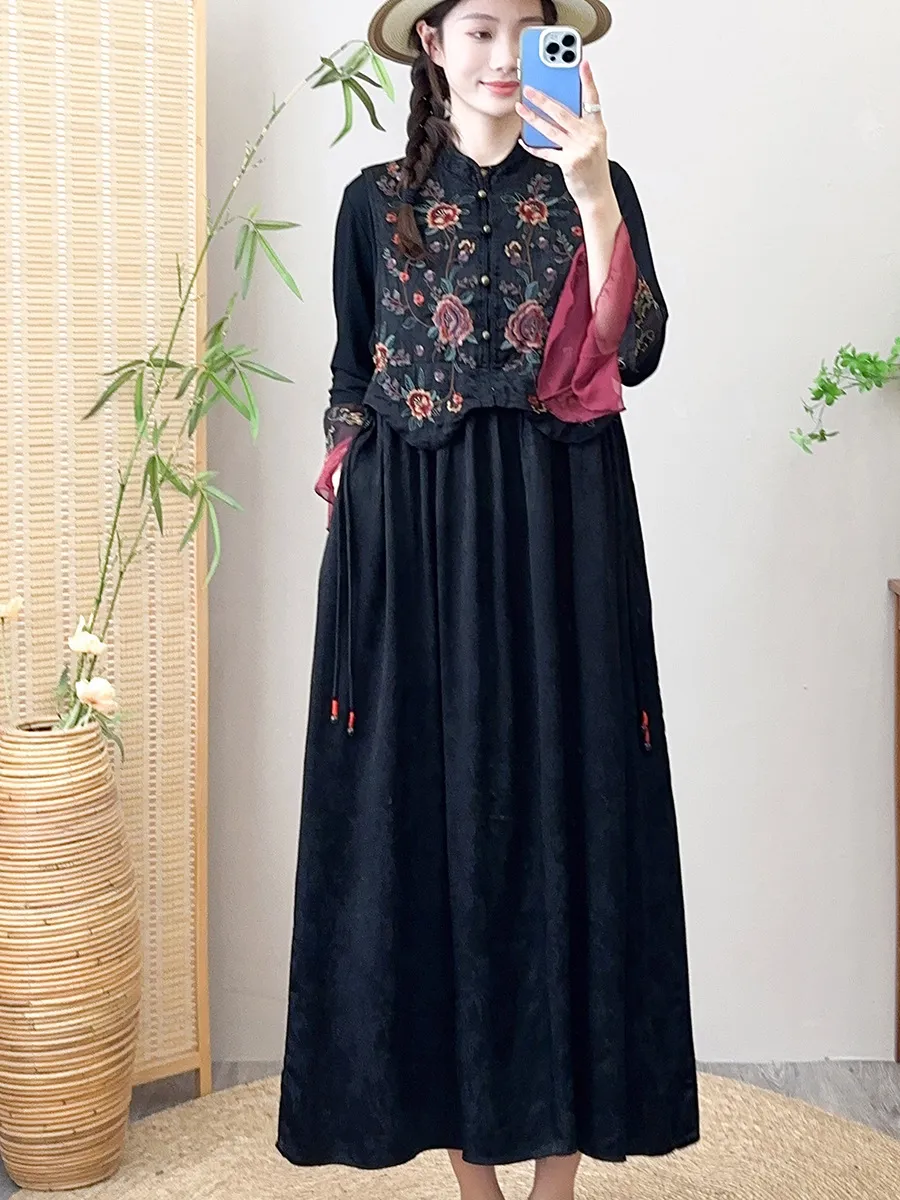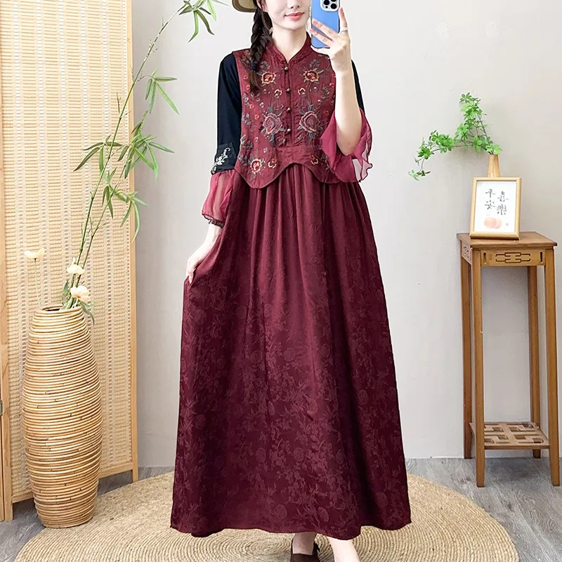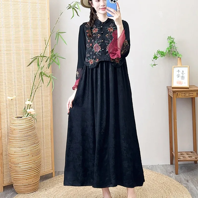 衣都精品- 2023新款復古民族風刺繡緞面連身裙