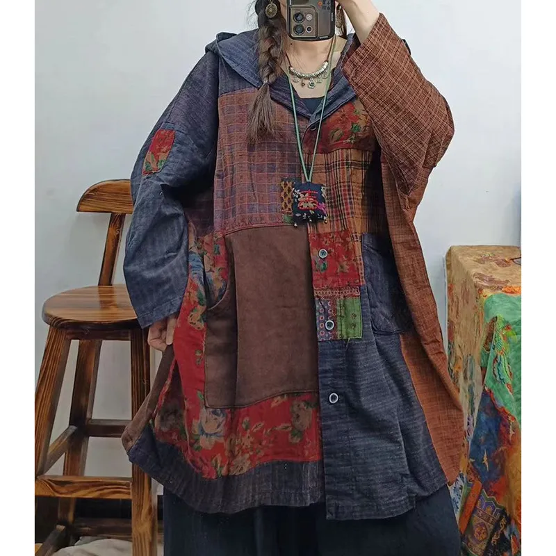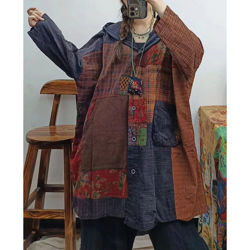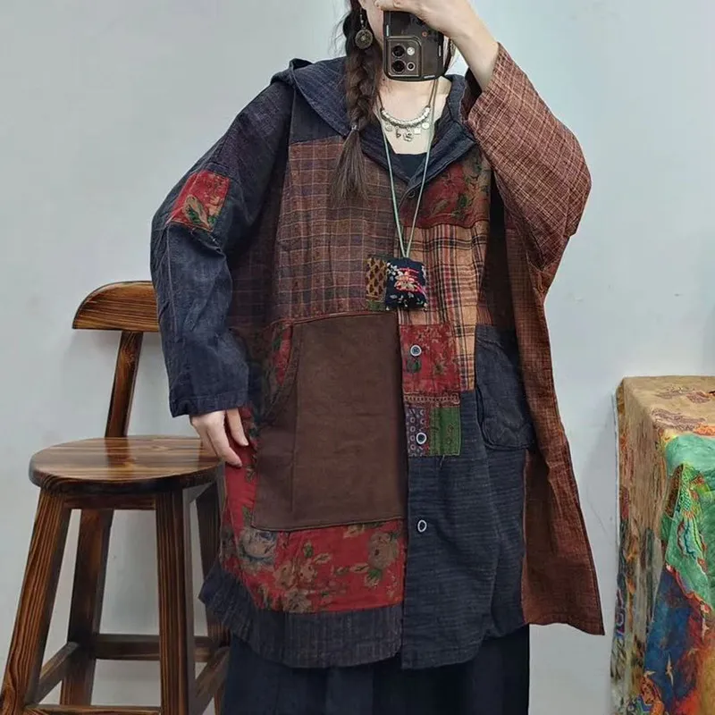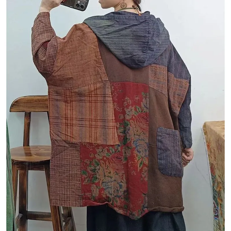 衣都精品- 2023新款寬鬆休閒連帽單排扣長袖拼接外套
