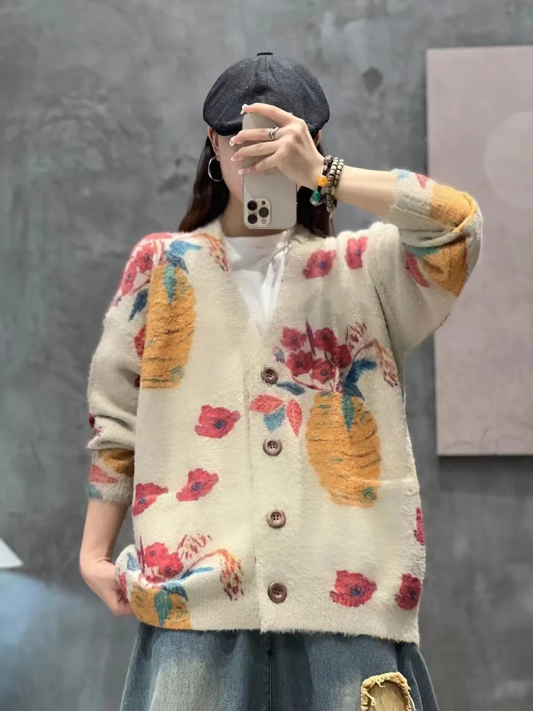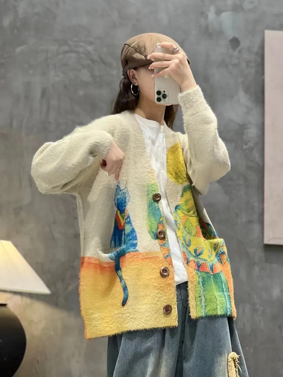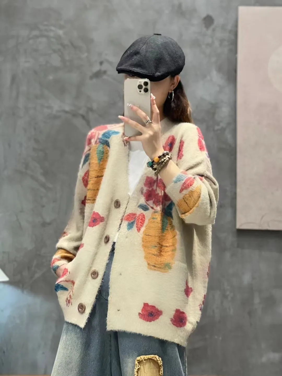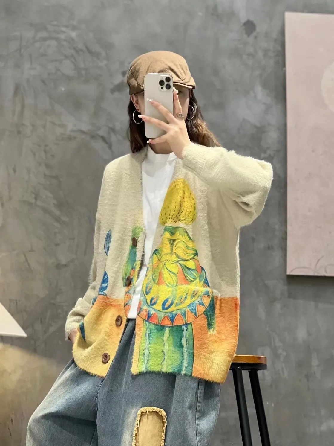 衣都精品- 2023新款卡通塗鴉水貂絨開襟針織外套
