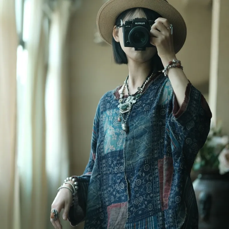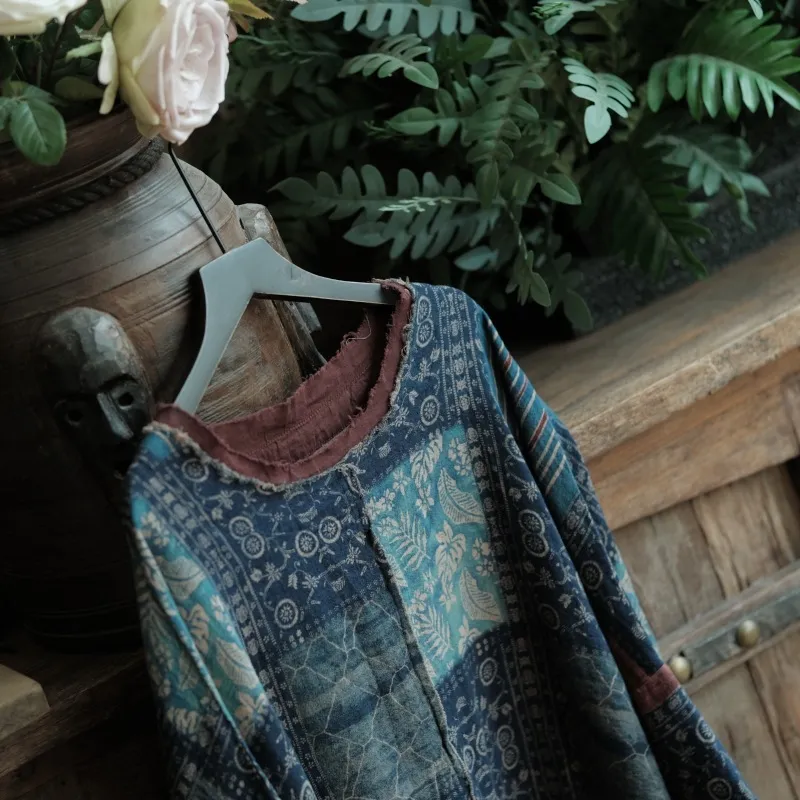 衣都精品- 2023新款文藝復古做舊感寬鬆印花連衣裙