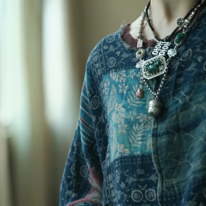 衣都精品- 2023新款復古做舊寬鬆對襟袖口拼色上衣