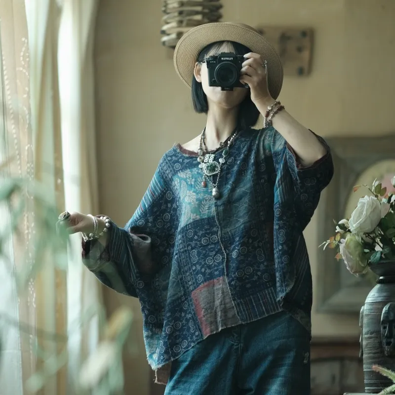 衣都精品- 2023新款復古文藝數碼印花圓領毛邊上衣
