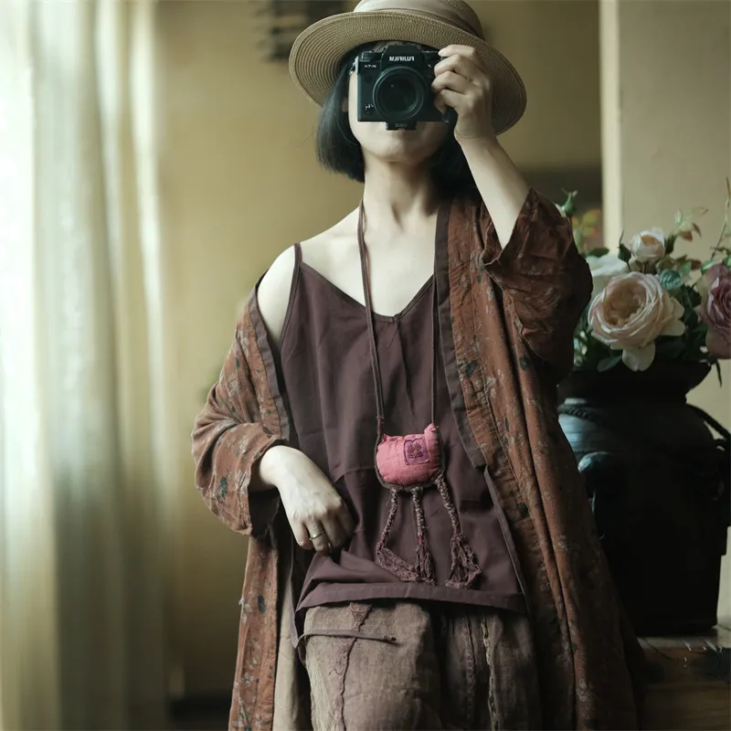 衣都精品- 2023新款復古文藝數碼印花圓領毛邊上衣