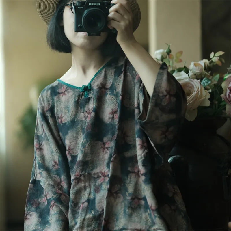 衣都精品- 2023新款數碼印花寬鬆盤扣V領上衣