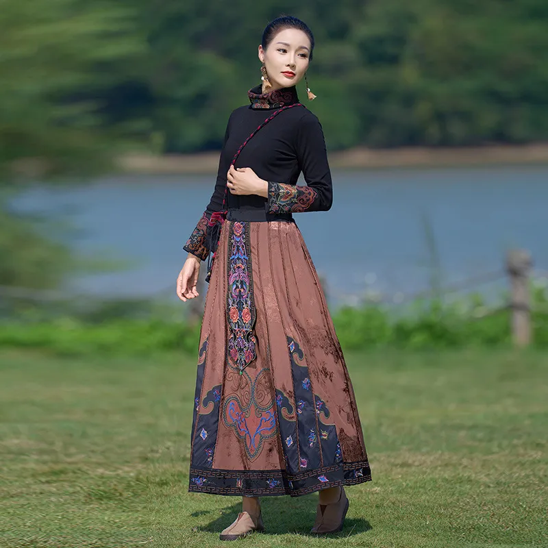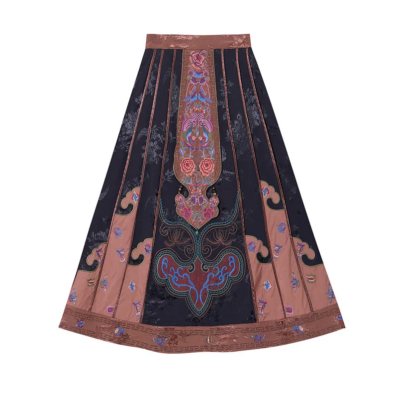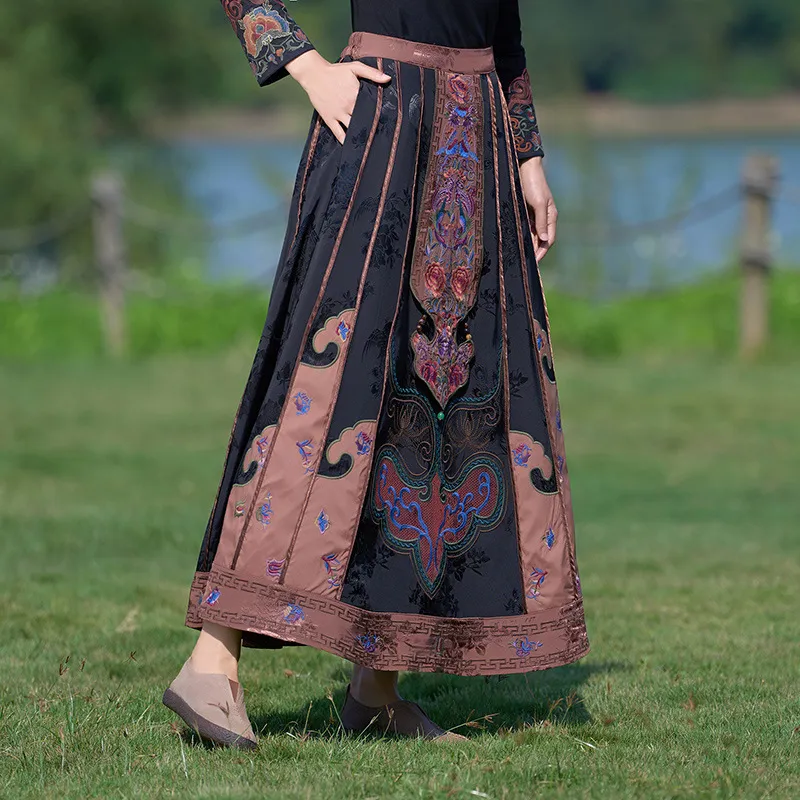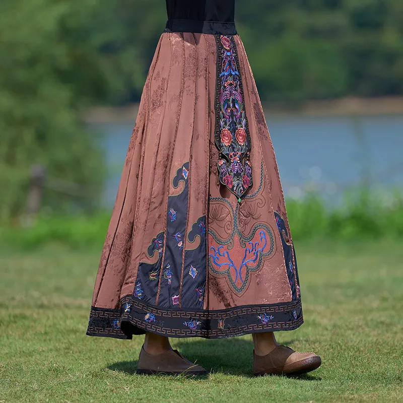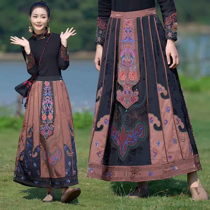 衣都精品- 2023新款民族風拼色提花大擺皺褶半身裙