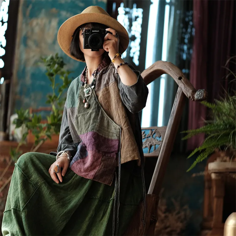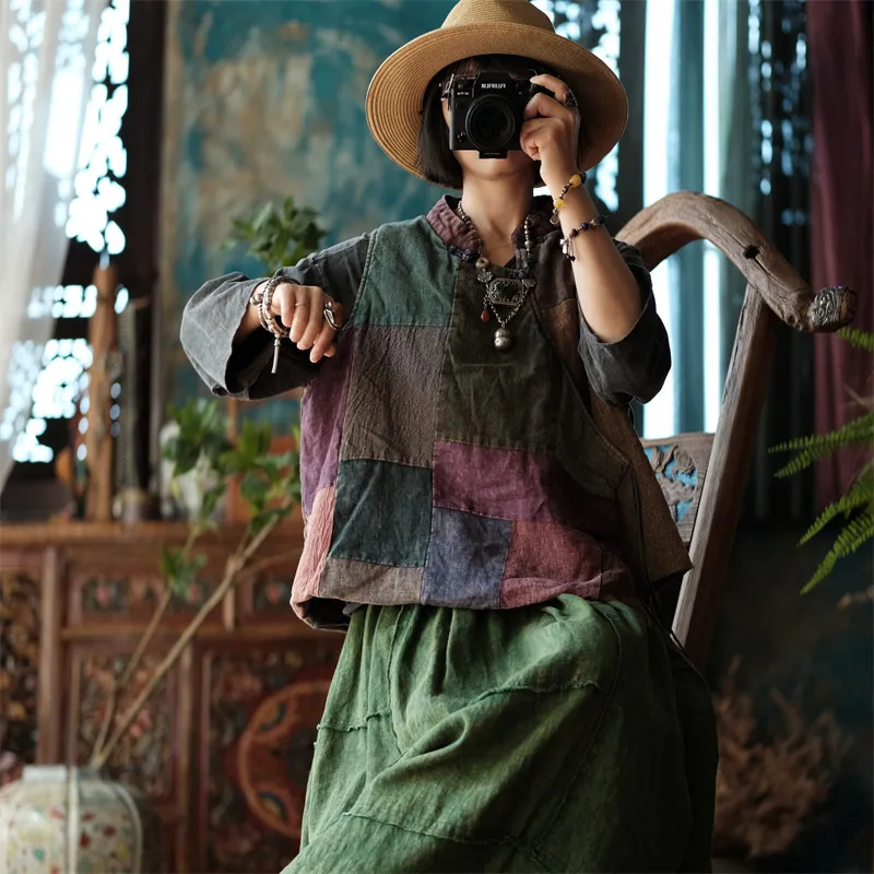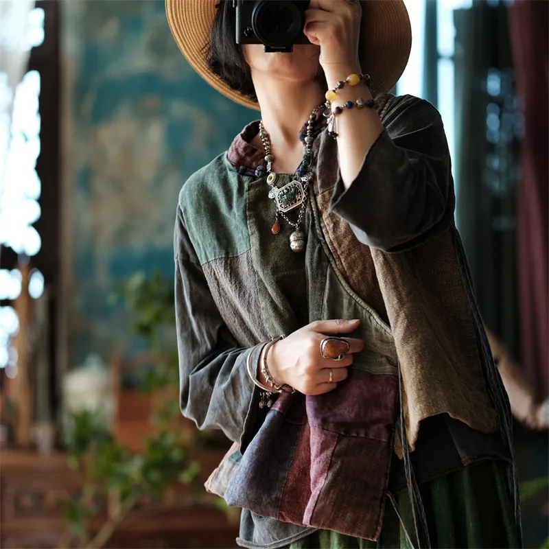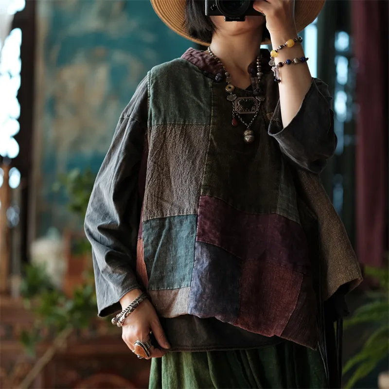 衣都精品- 2023新款老粗布拼布蝙蝠袖開襟外套