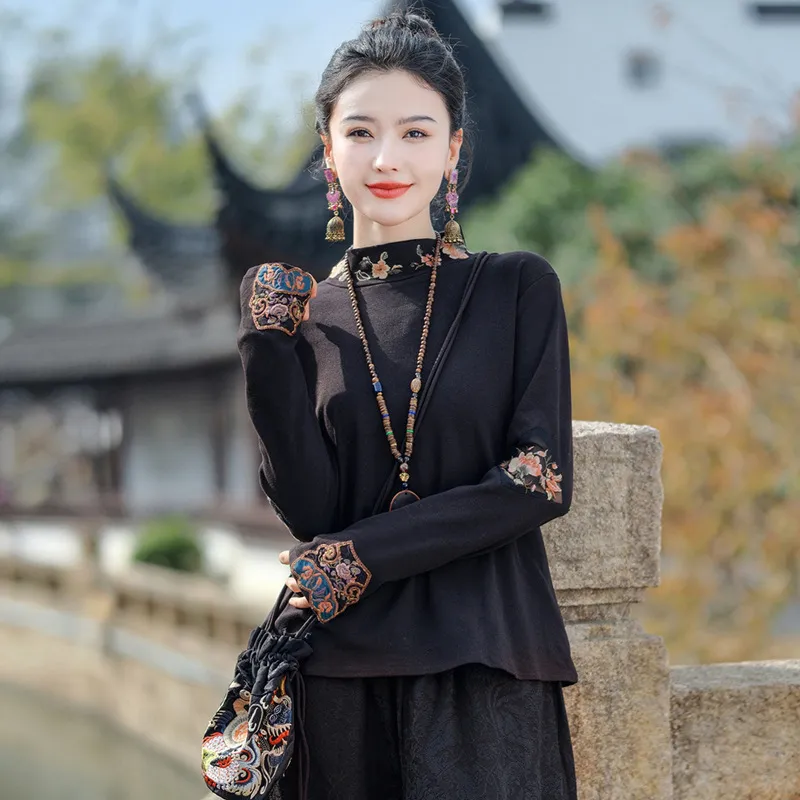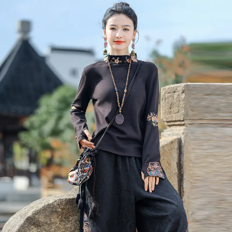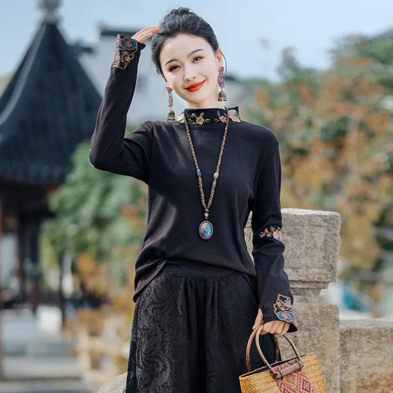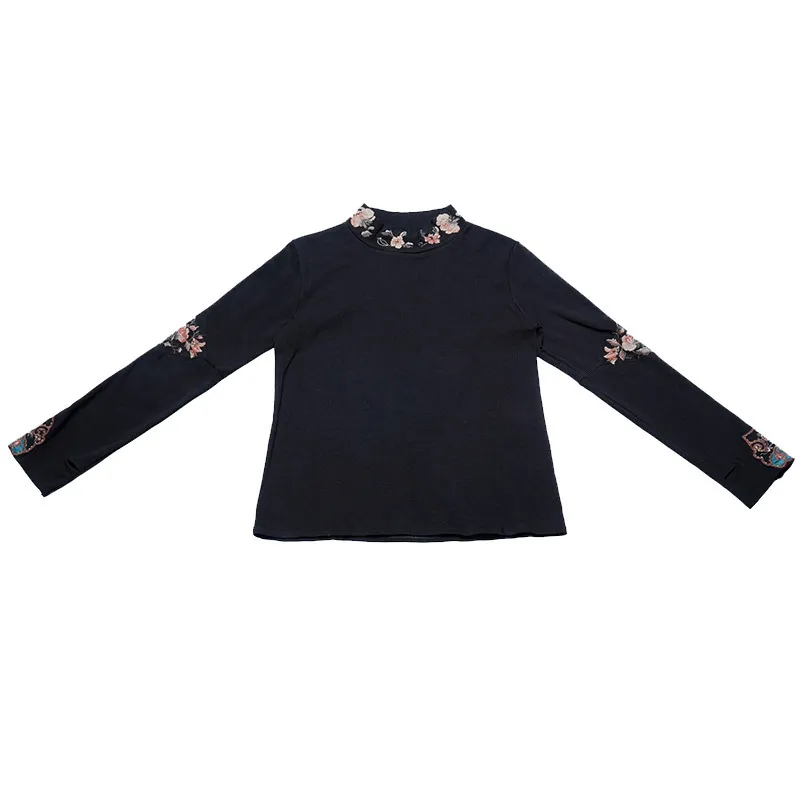 衣都精品- 2023新款民族風高領繡花百搭修身內搭上衣