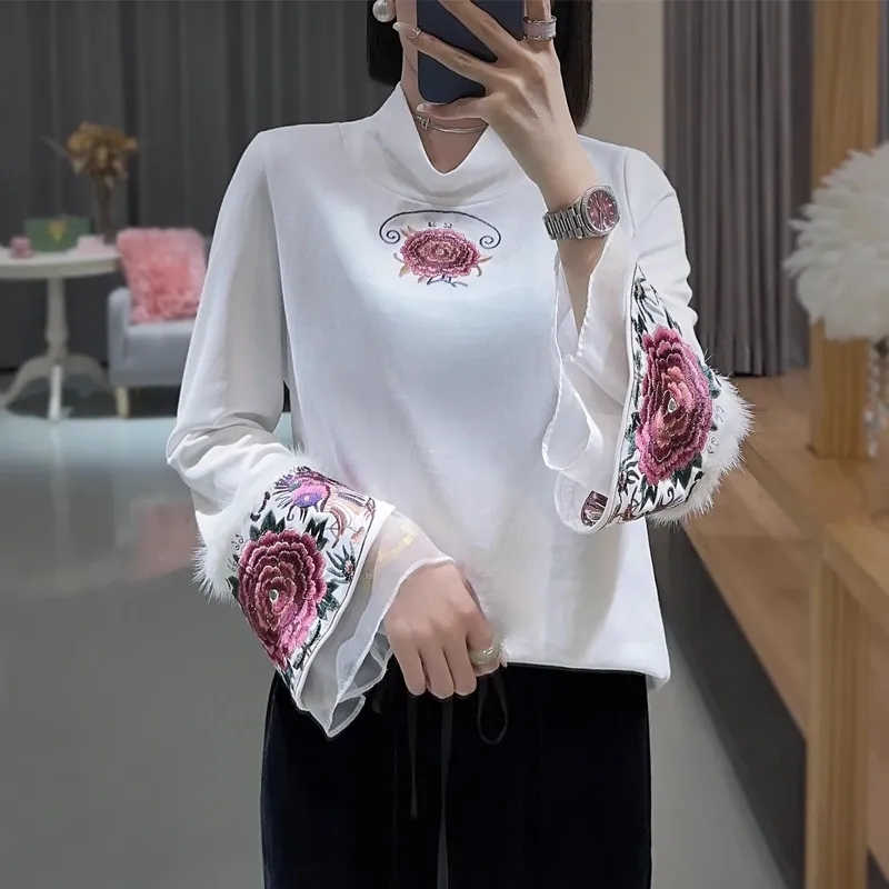 衣都精品- 2023新款喇叭袖刺繡拼接兔毛百搭上衣