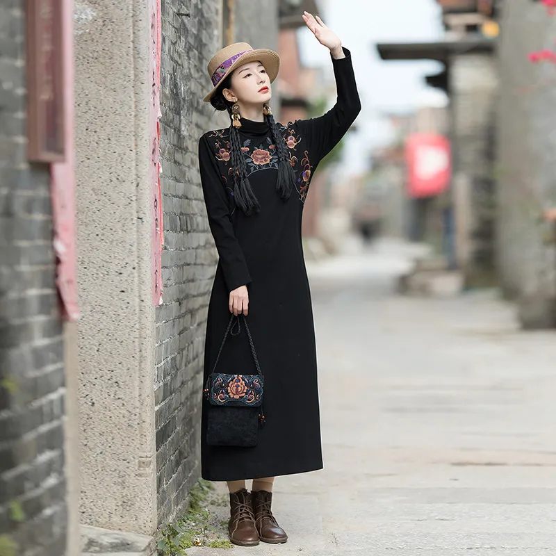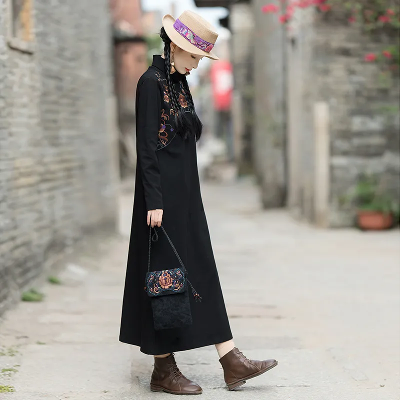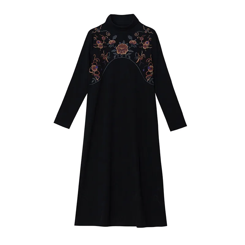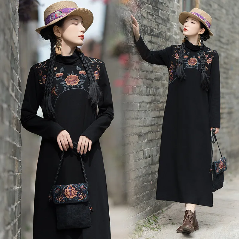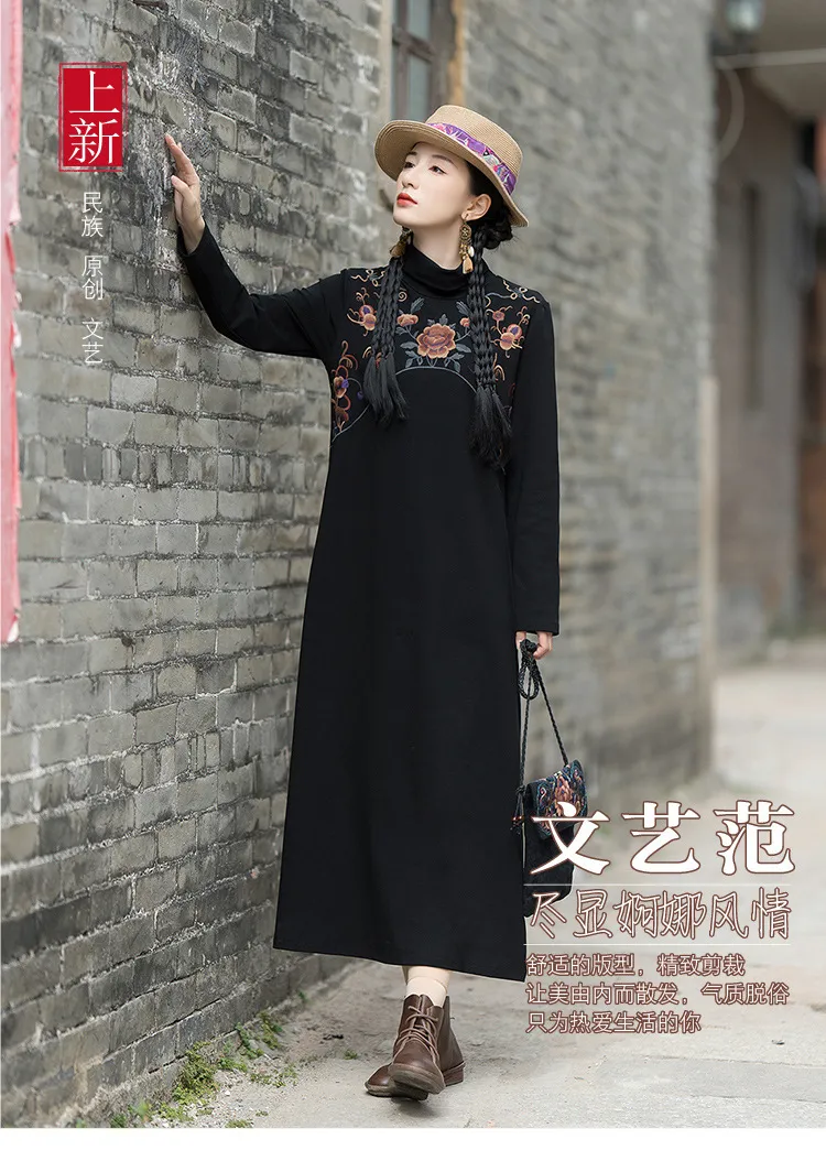 衣都精品- 2023新款復古民族風高領長袖刺繡連衣裙
