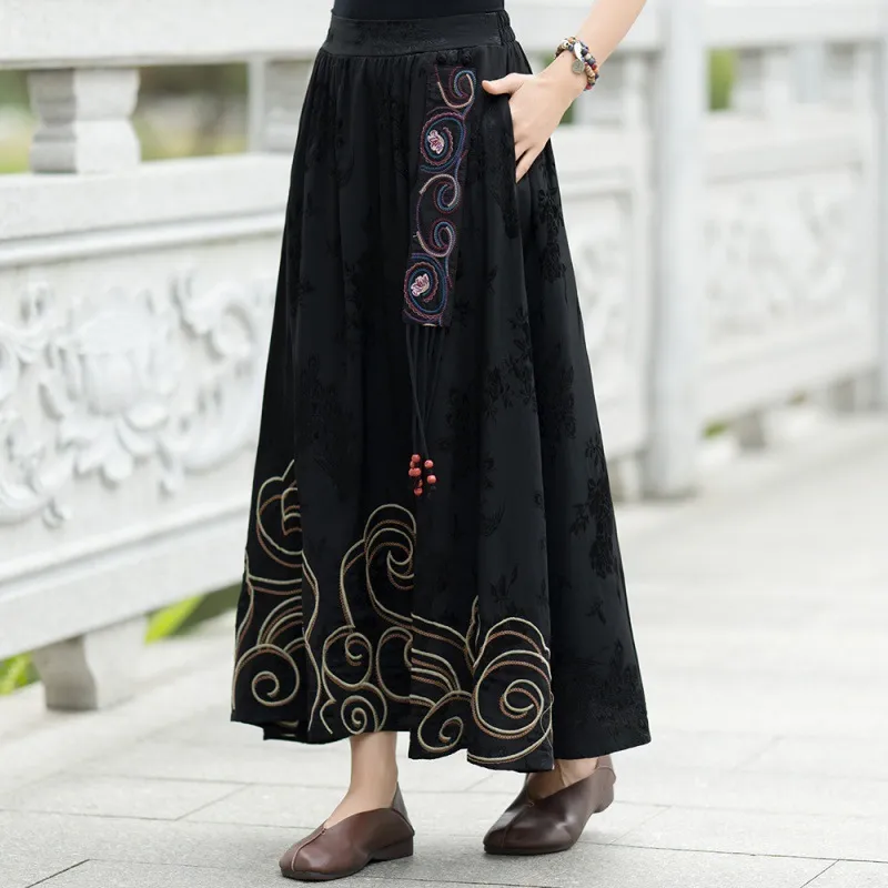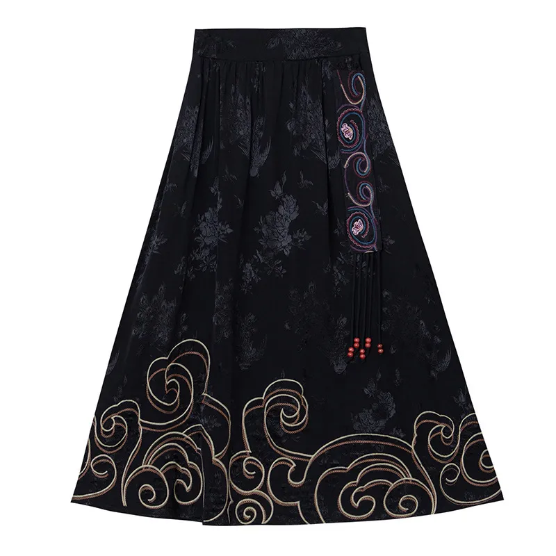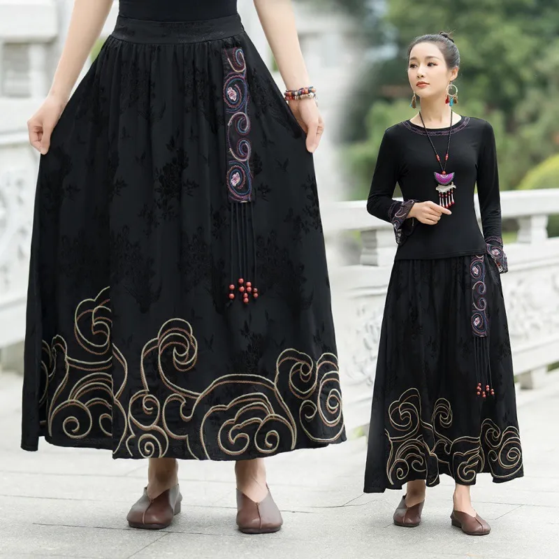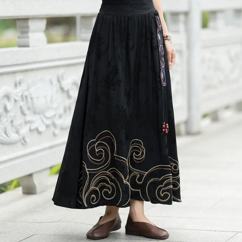衣都精品- 2023新款民族風重工刺繡緞面提花鬆緊腰半身裙
