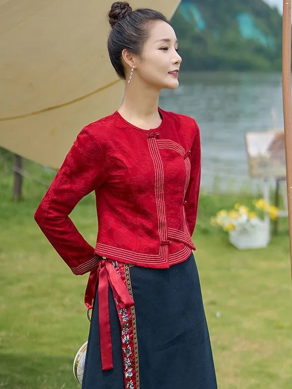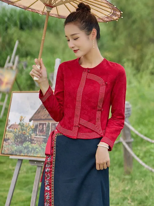 衣都精品- 2023新款民族風刺繡立領盤扣緞面提花外套