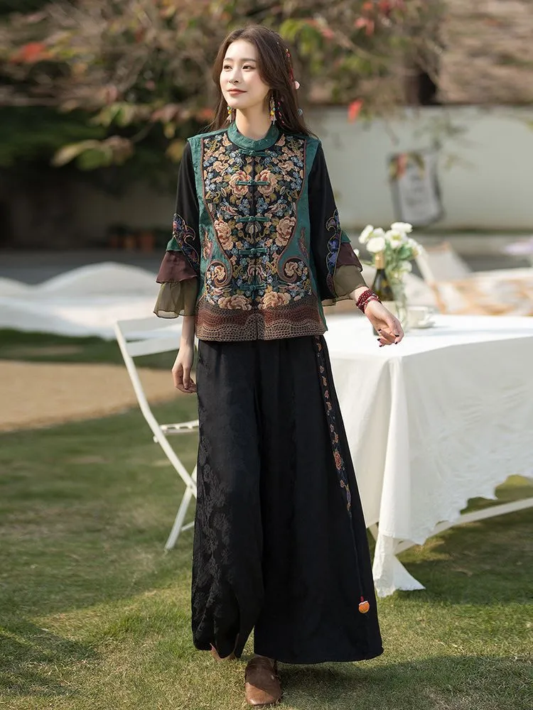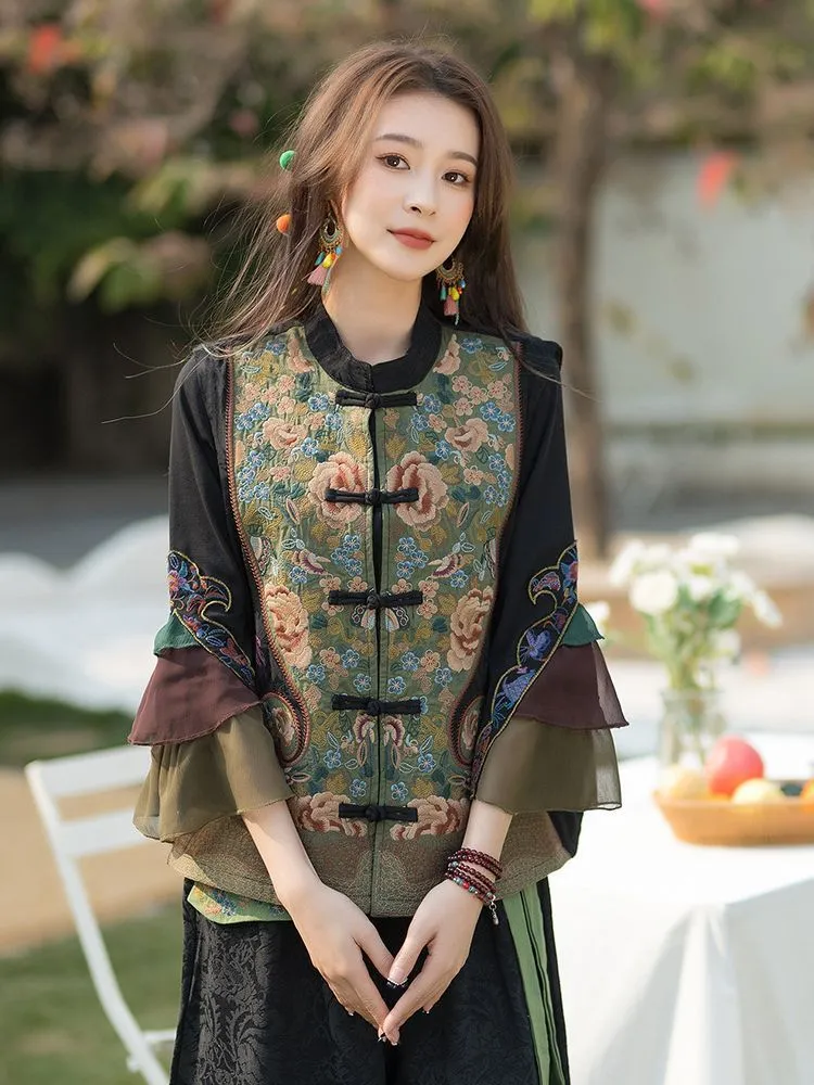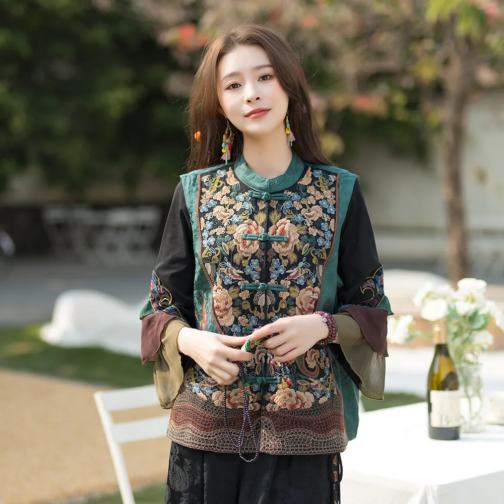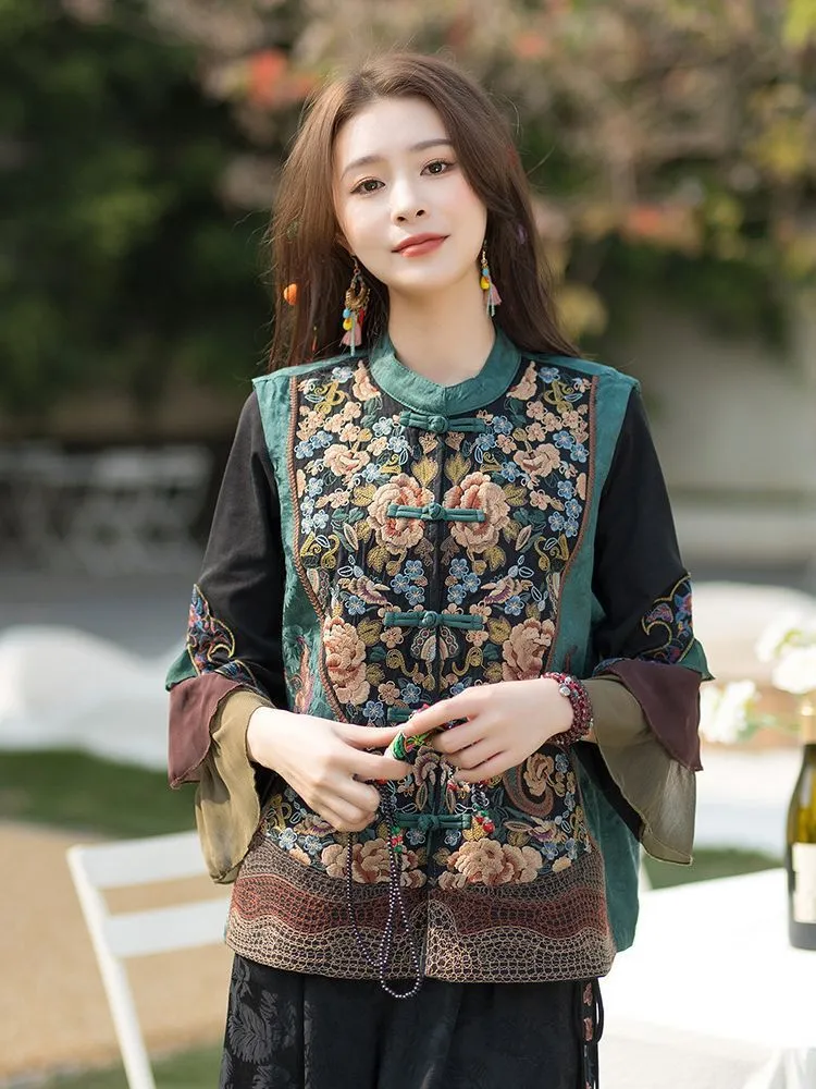 衣都精品- 2023新款民族風刺繡立領盤扣緞面提花外套