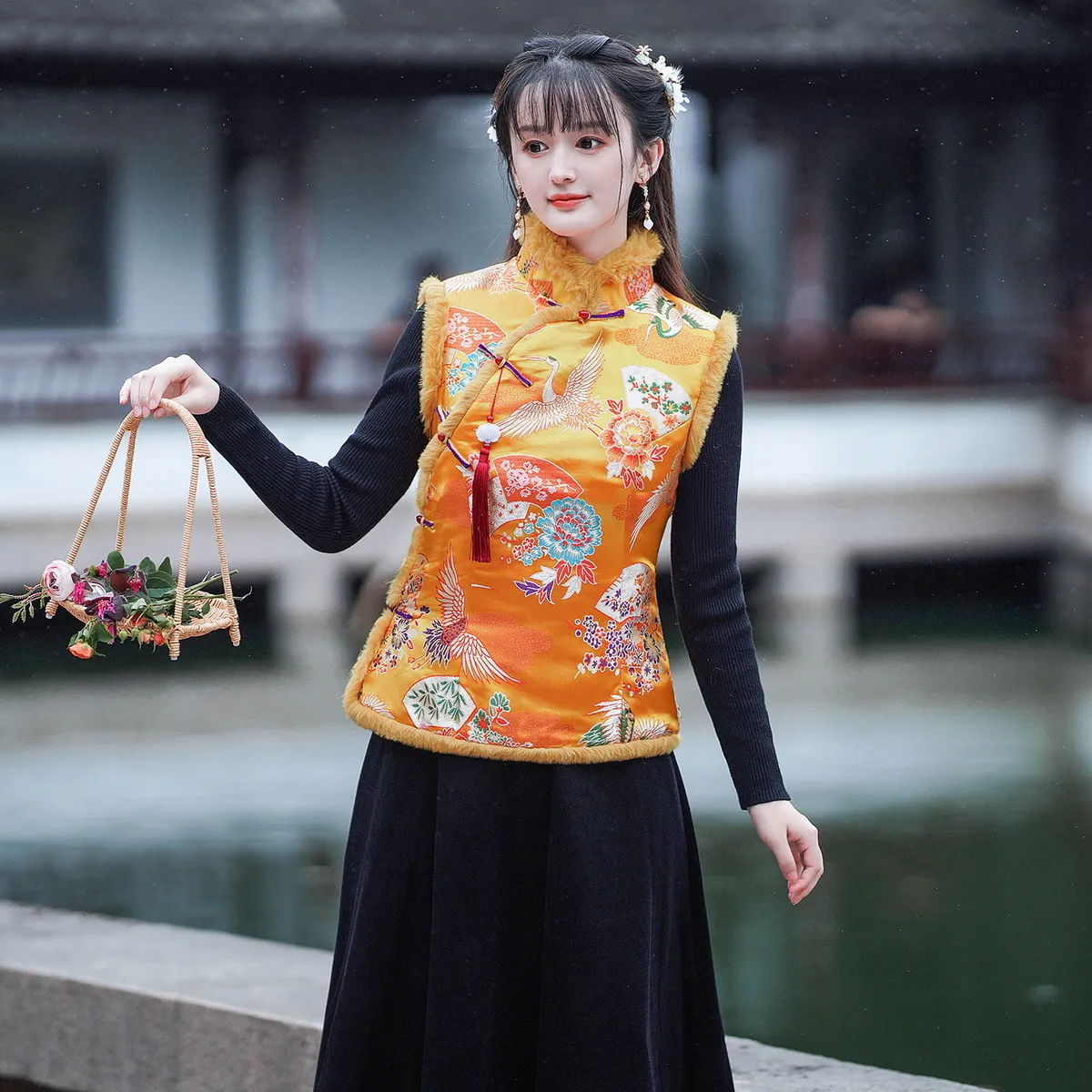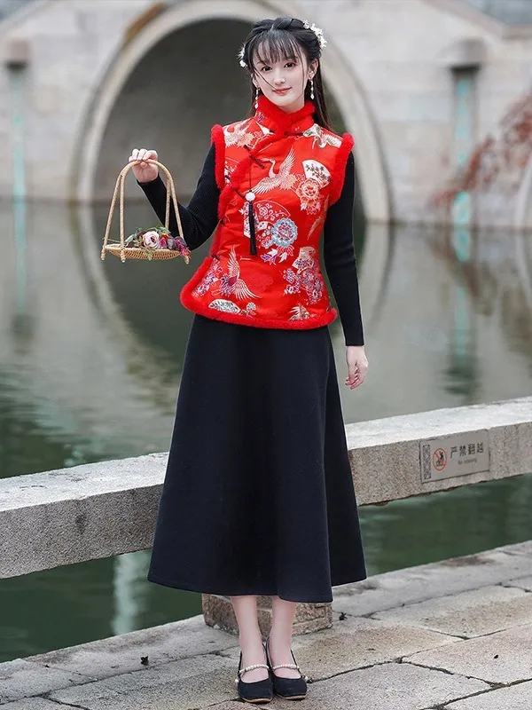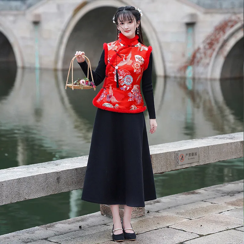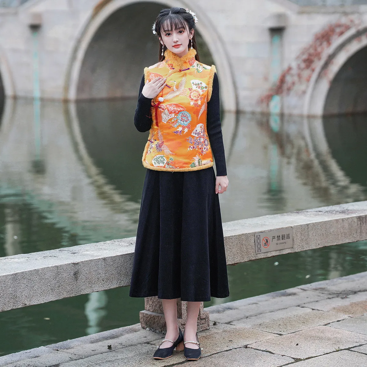 衣都精品- 2023新款復古刺繡提花毛領夾棉旗袍外套