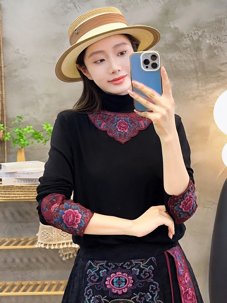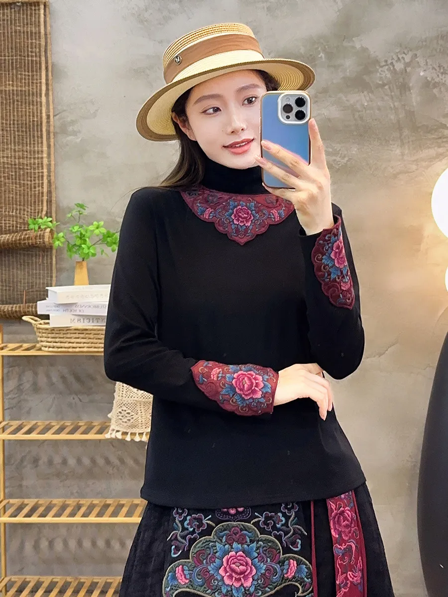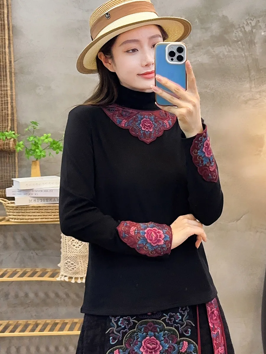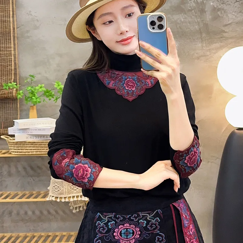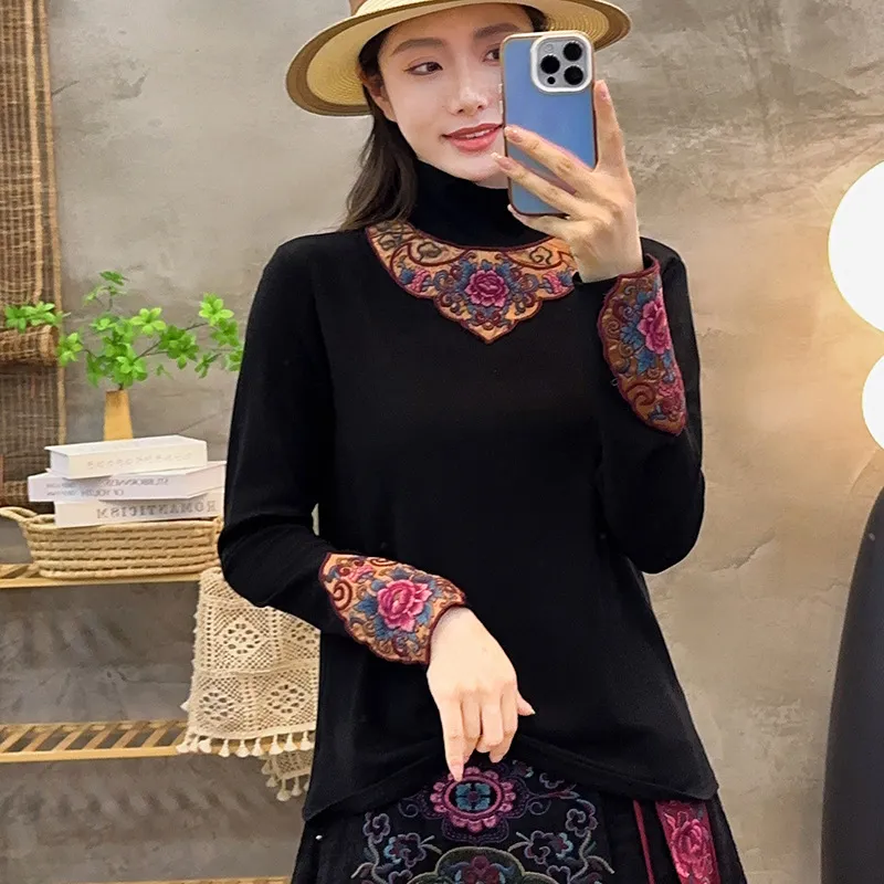 衣都精品- 2023新款民族風刺繡高領長袖保暖上衣