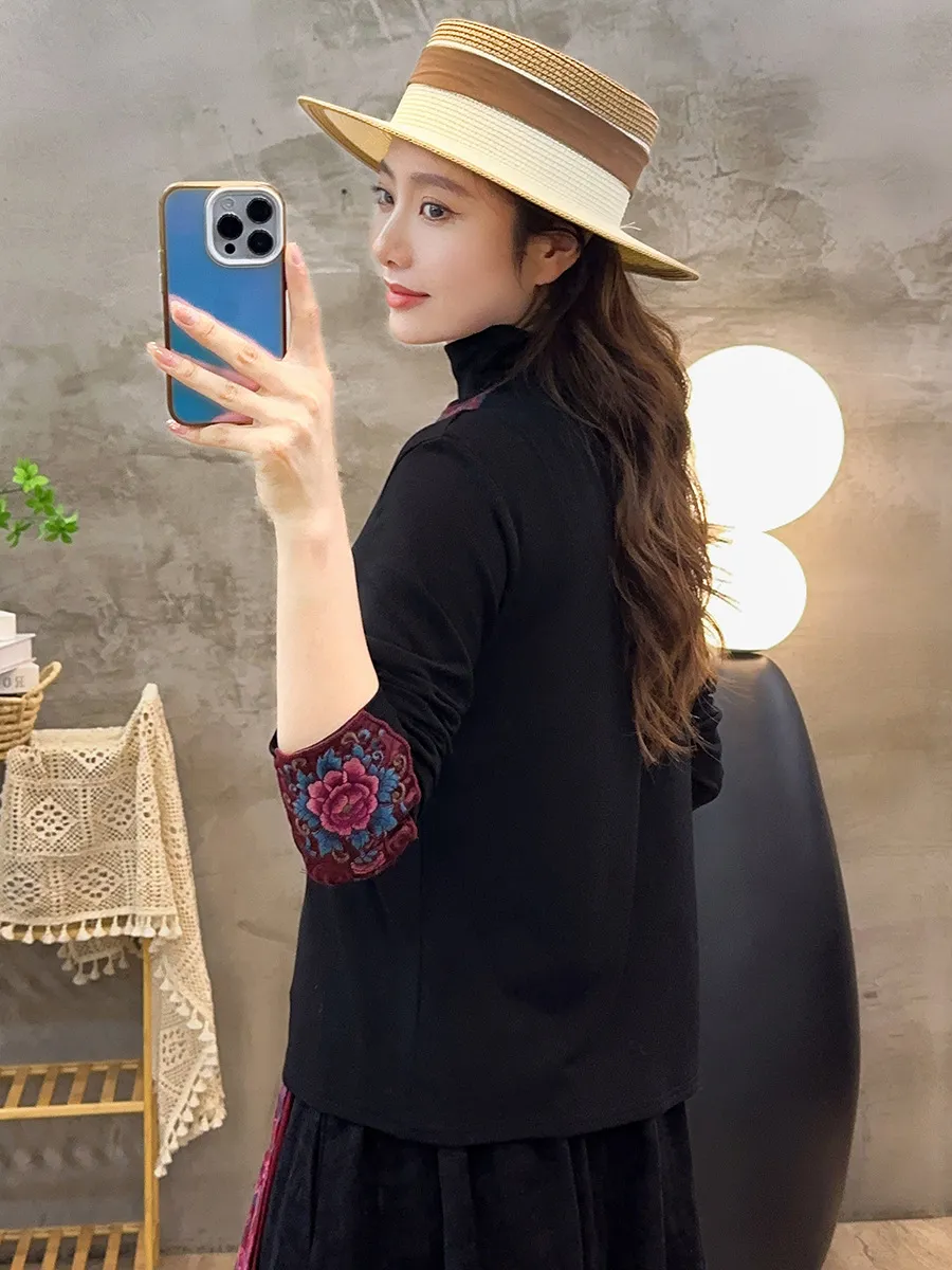 衣都精品- 2023新款民族風純色貼布繡高領長袖上衣