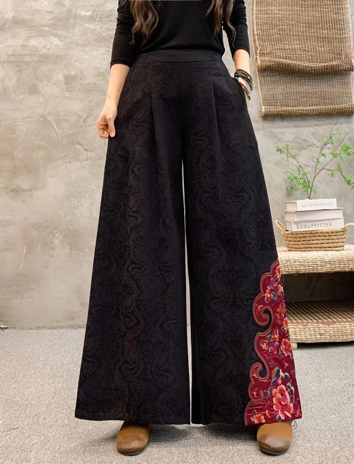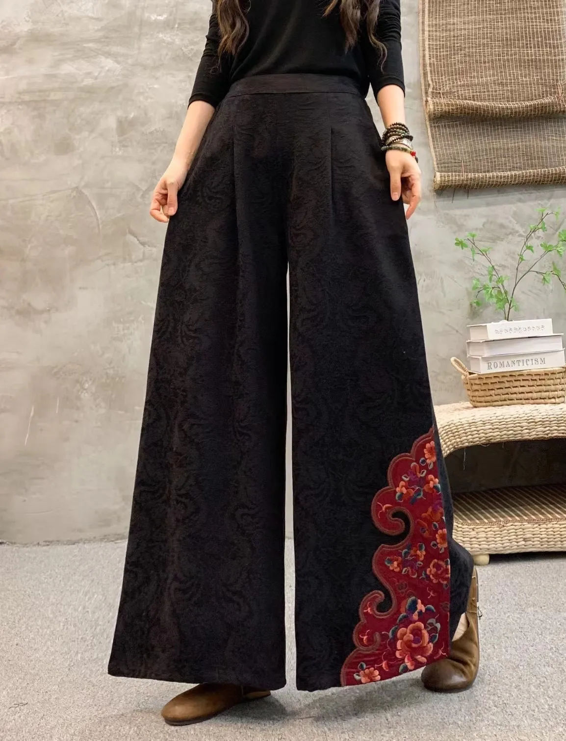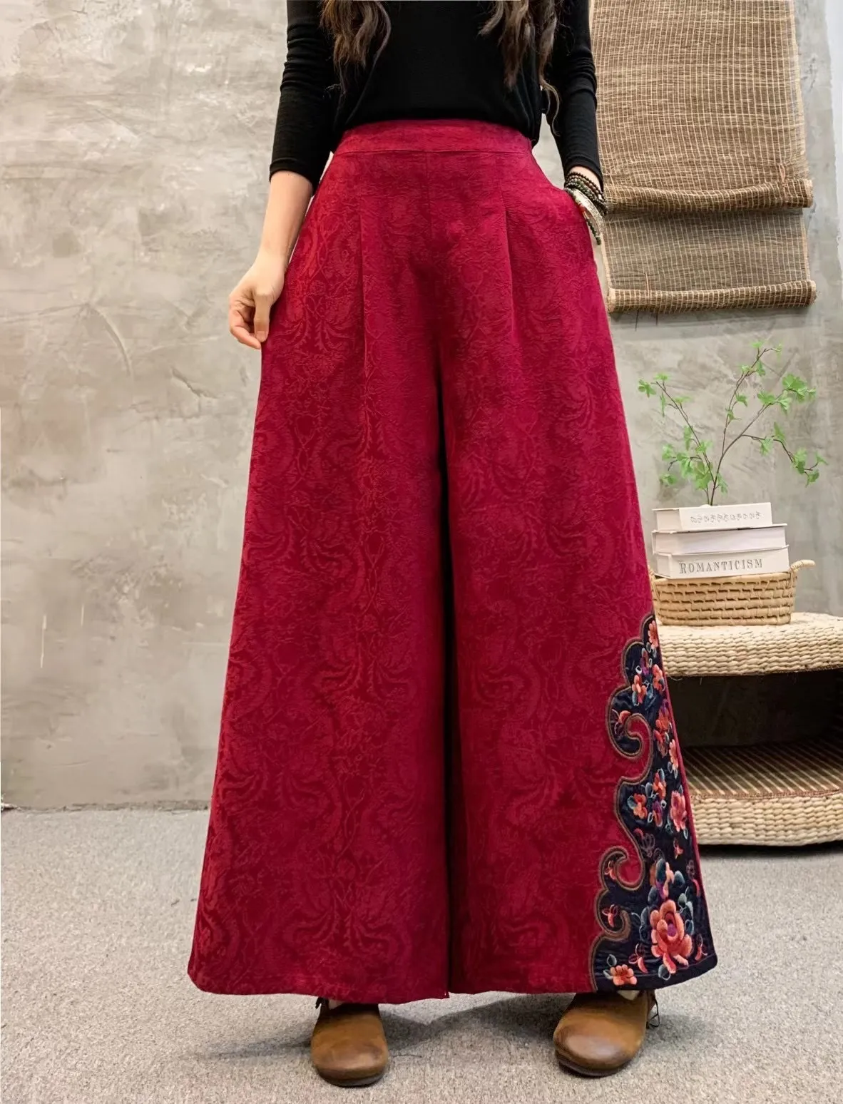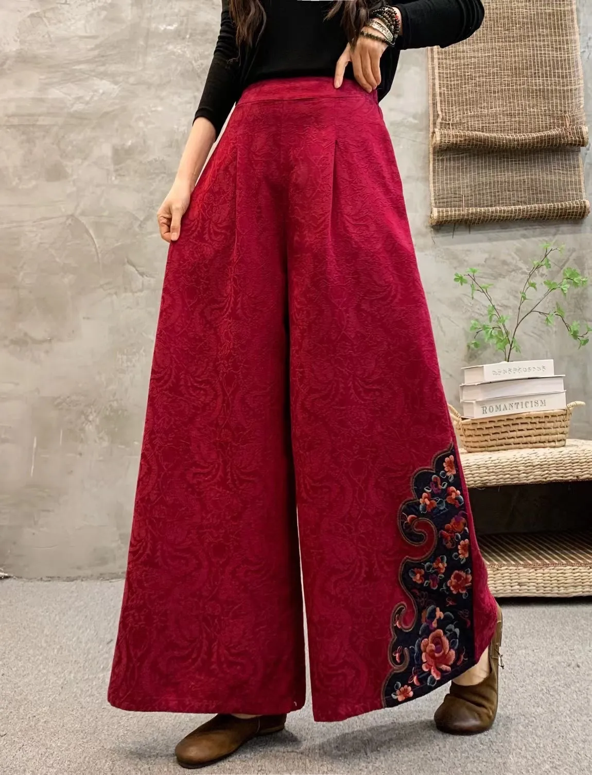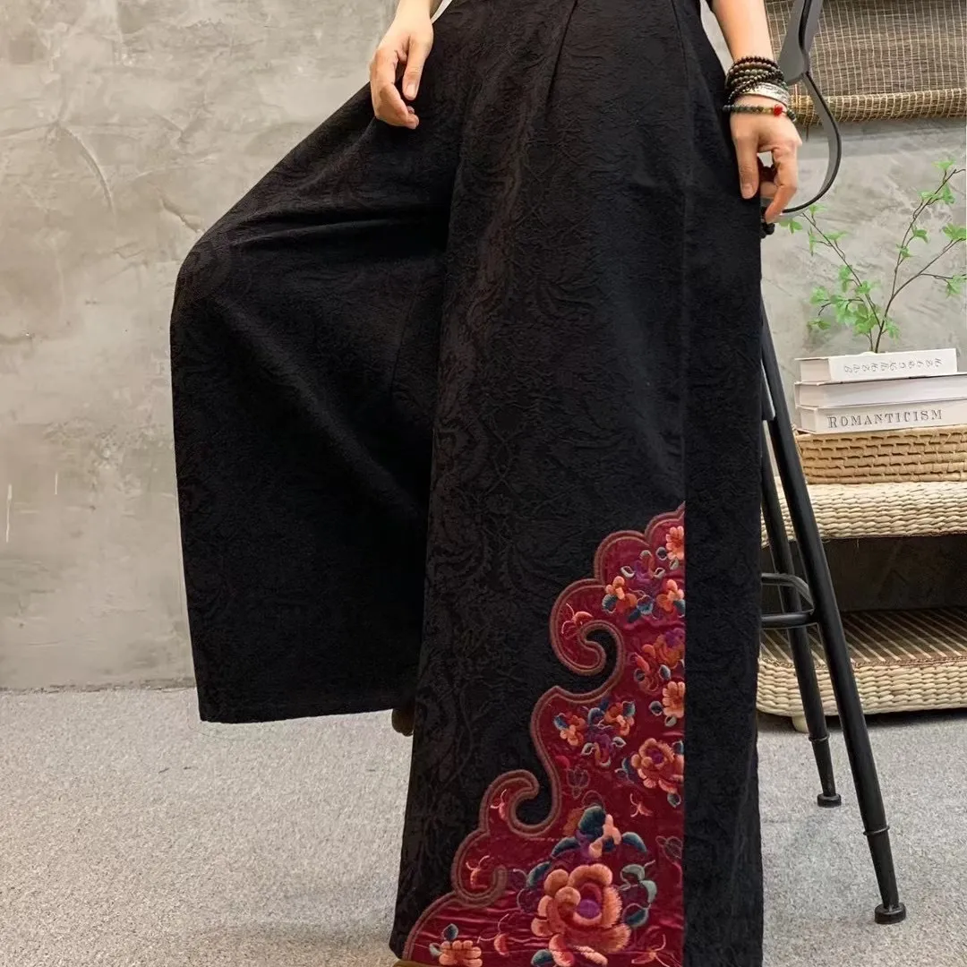 衣都精品- 2023新款民族風繡花鬆緊腰大擺闊腿褲