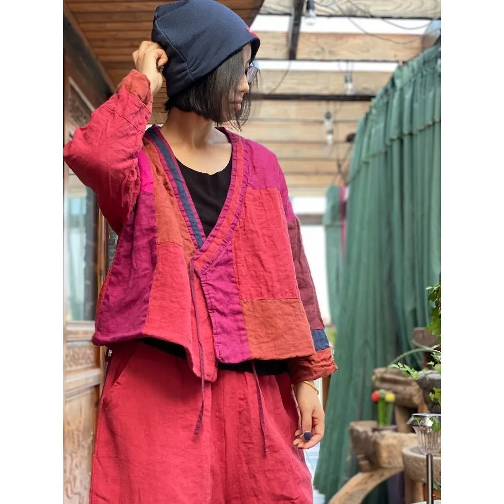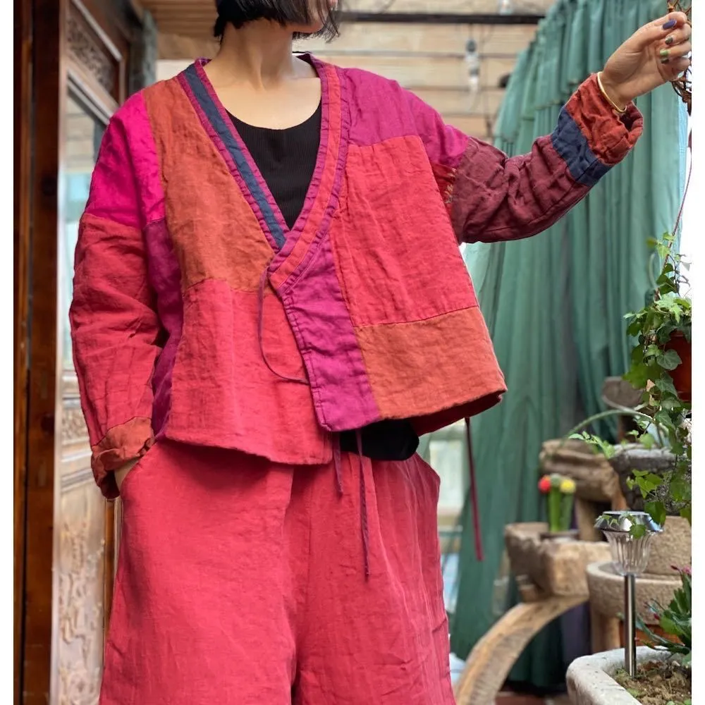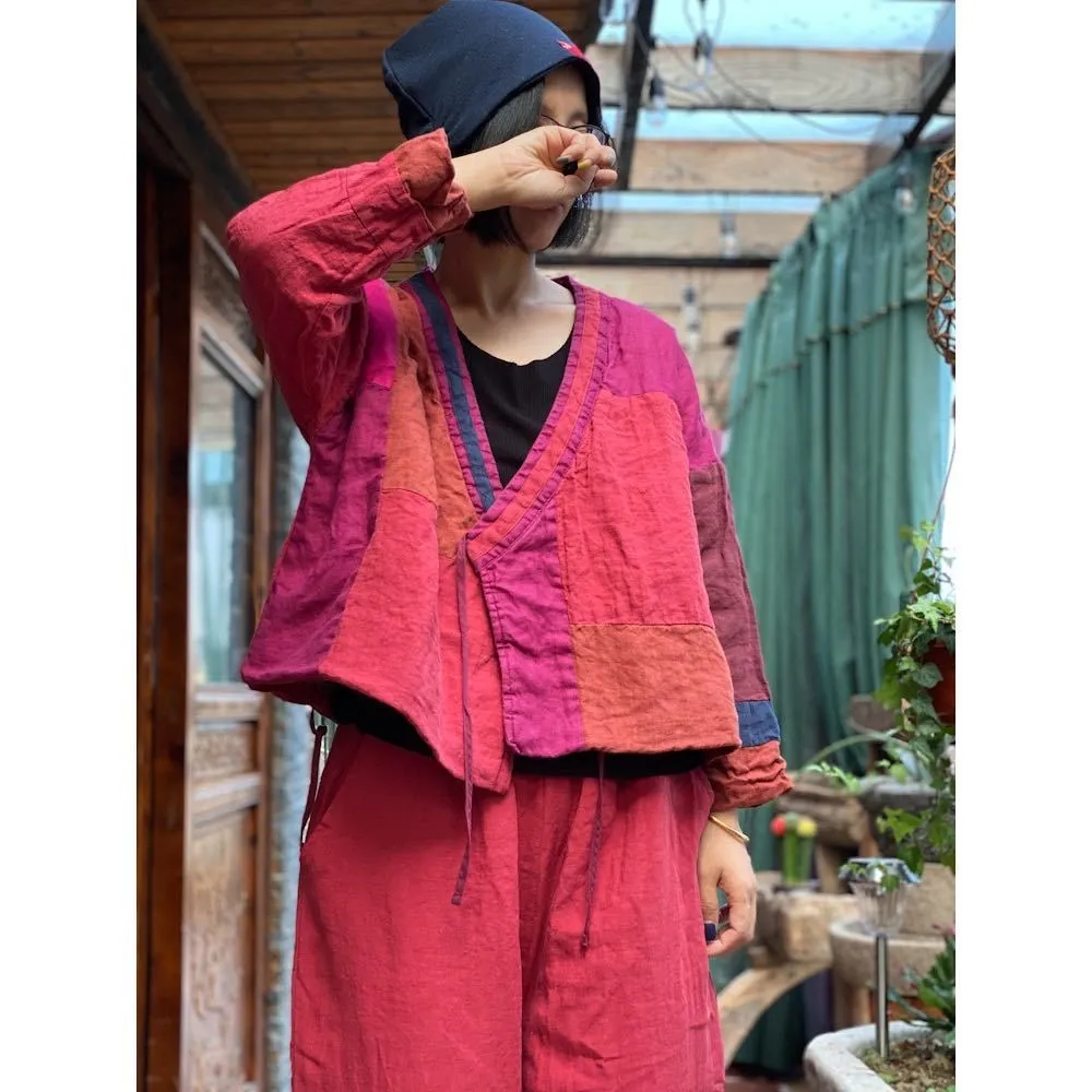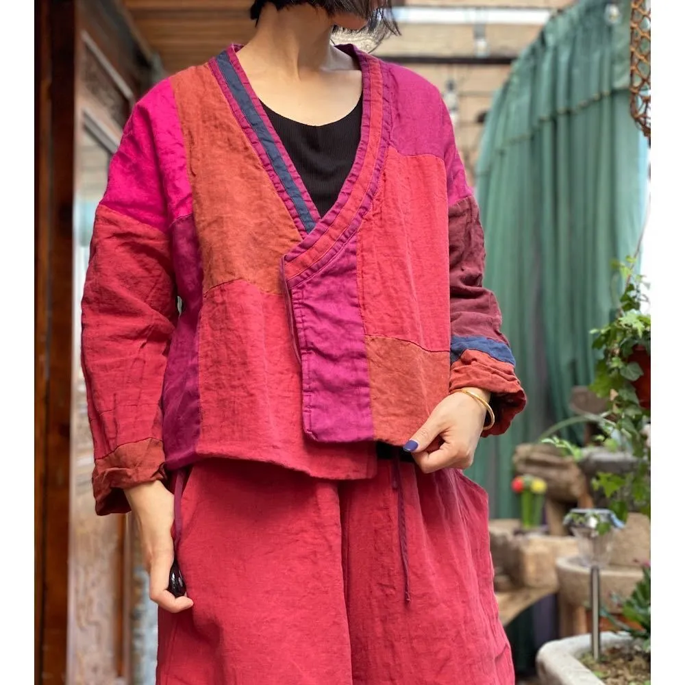 衣都精品- 2023新款民族風砂洗純亞麻拼布繫帶上衣