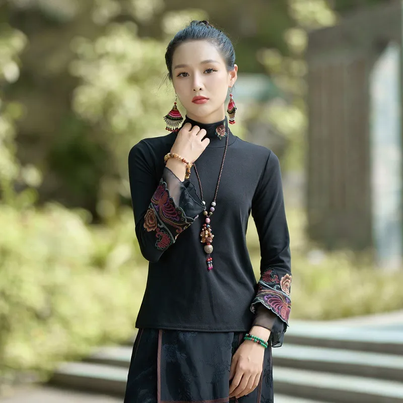 衣都精品- 2023新款民族風高領拼接花邊百搭繡花上衣
