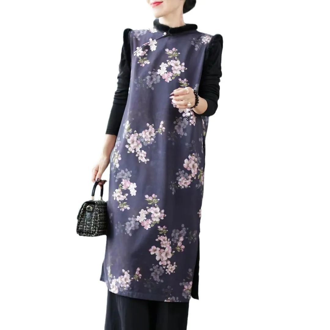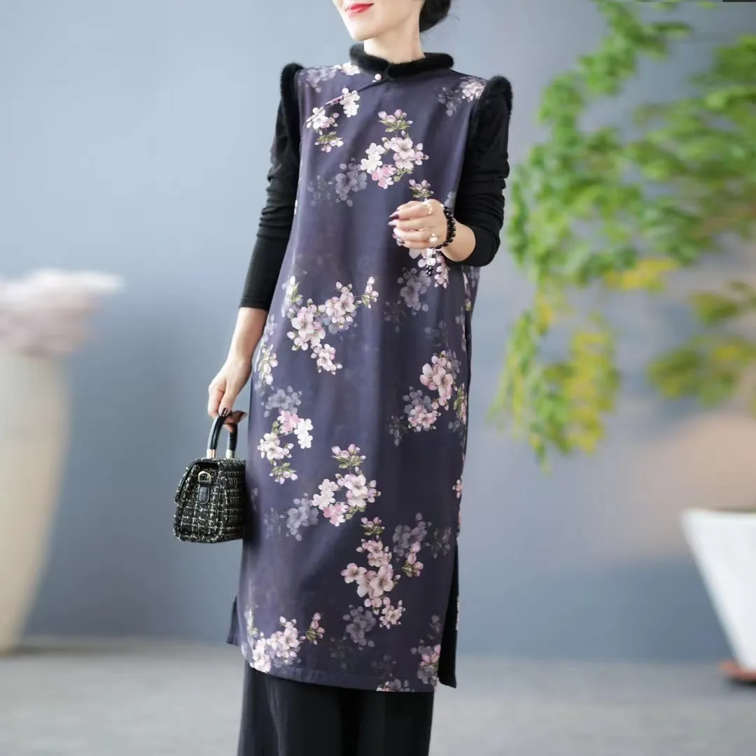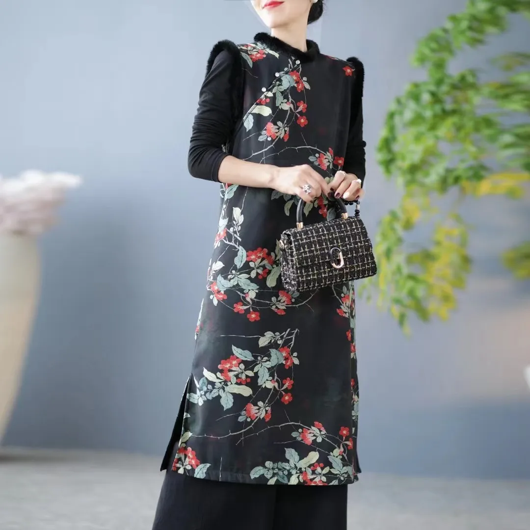 衣都精品- 2023新款復古斜襟無袖旗袍加絨毛邊連衣裙