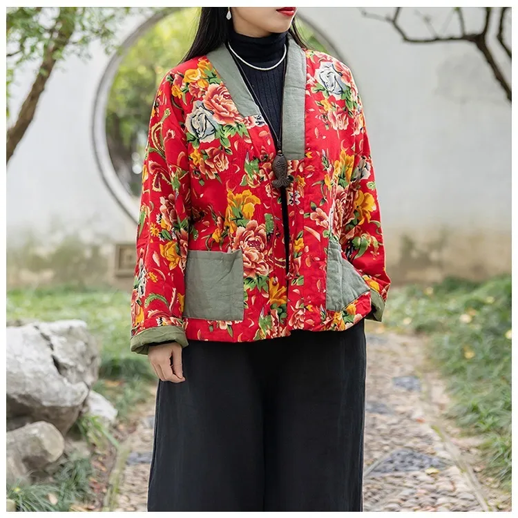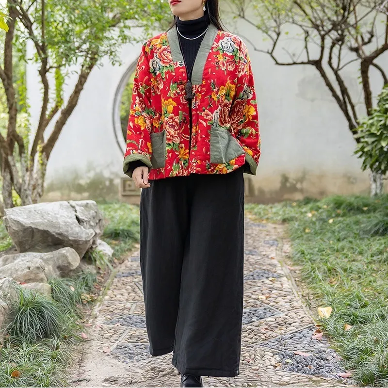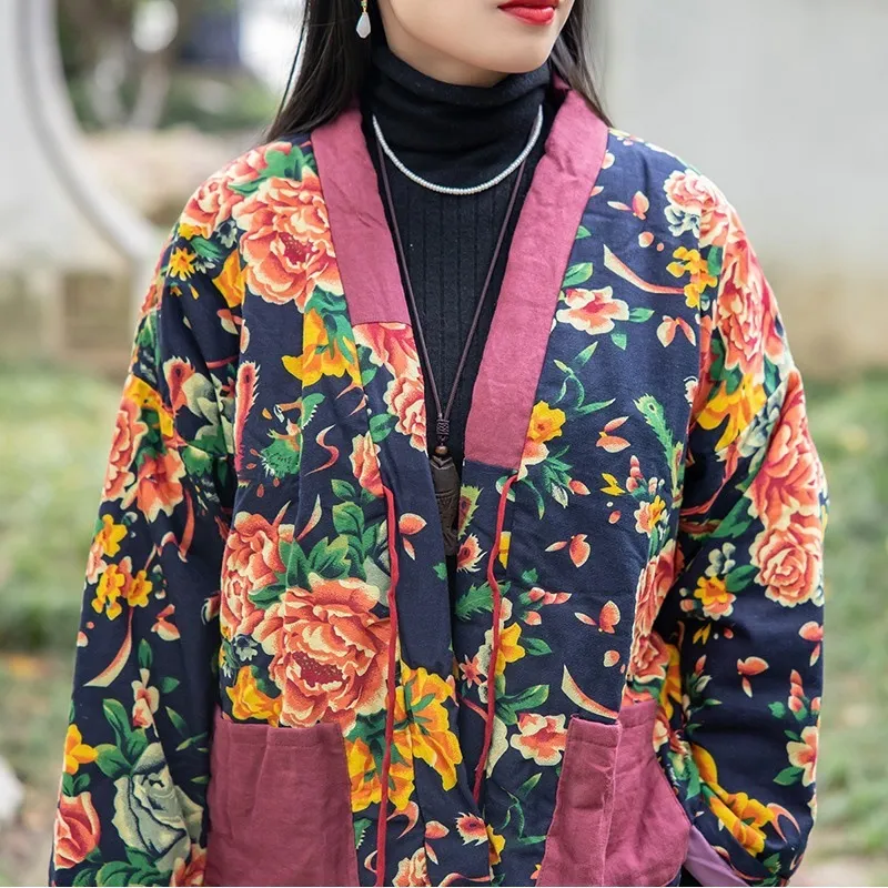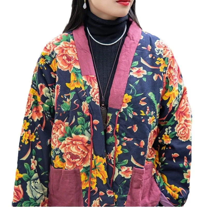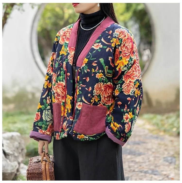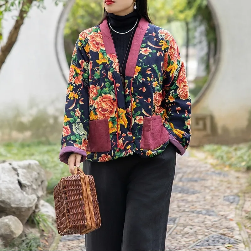 衣都精品- 2023新款文藝復古V領盤扣碎花夾棉外套