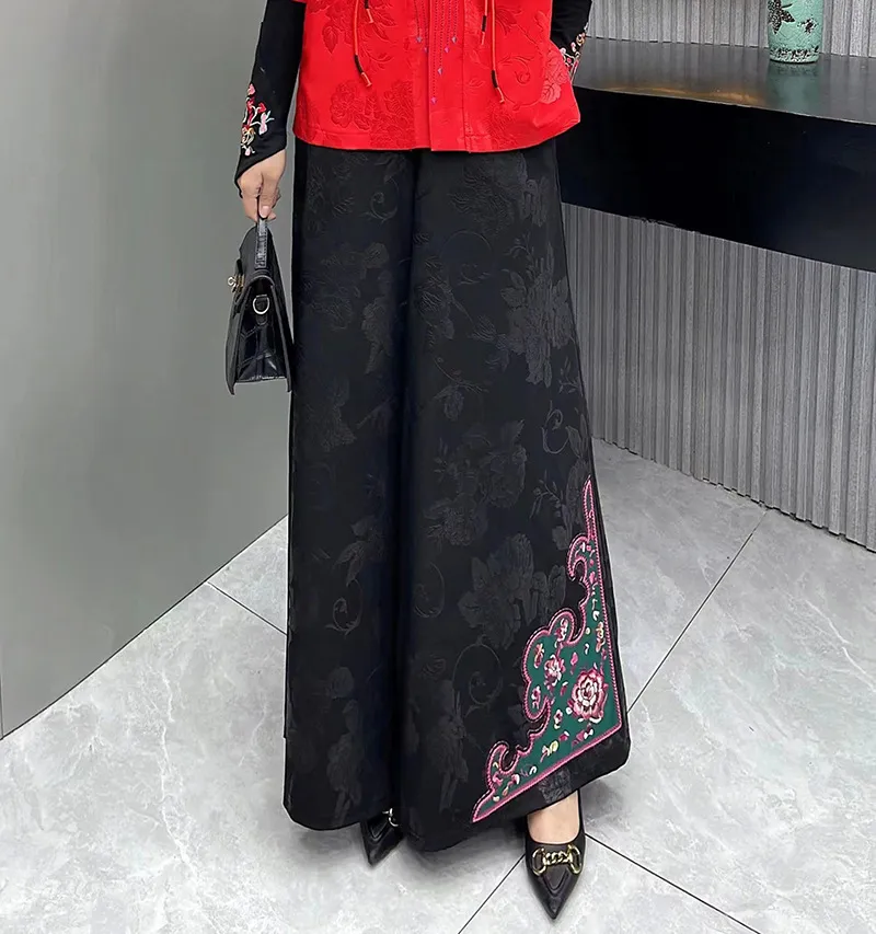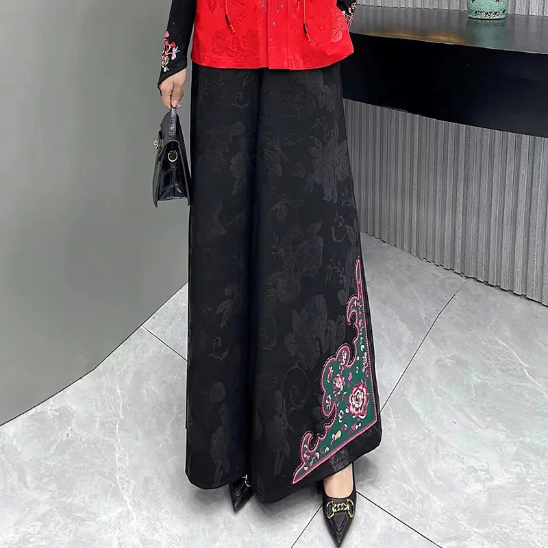 衣都精品- 2023新款民族風繡花寬鬆復古大碼闊腿褲