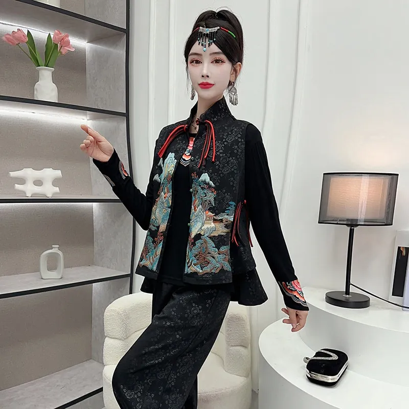 衣都精品- 2023新款民族風繡花寬鬆復古大碼闊腿褲
