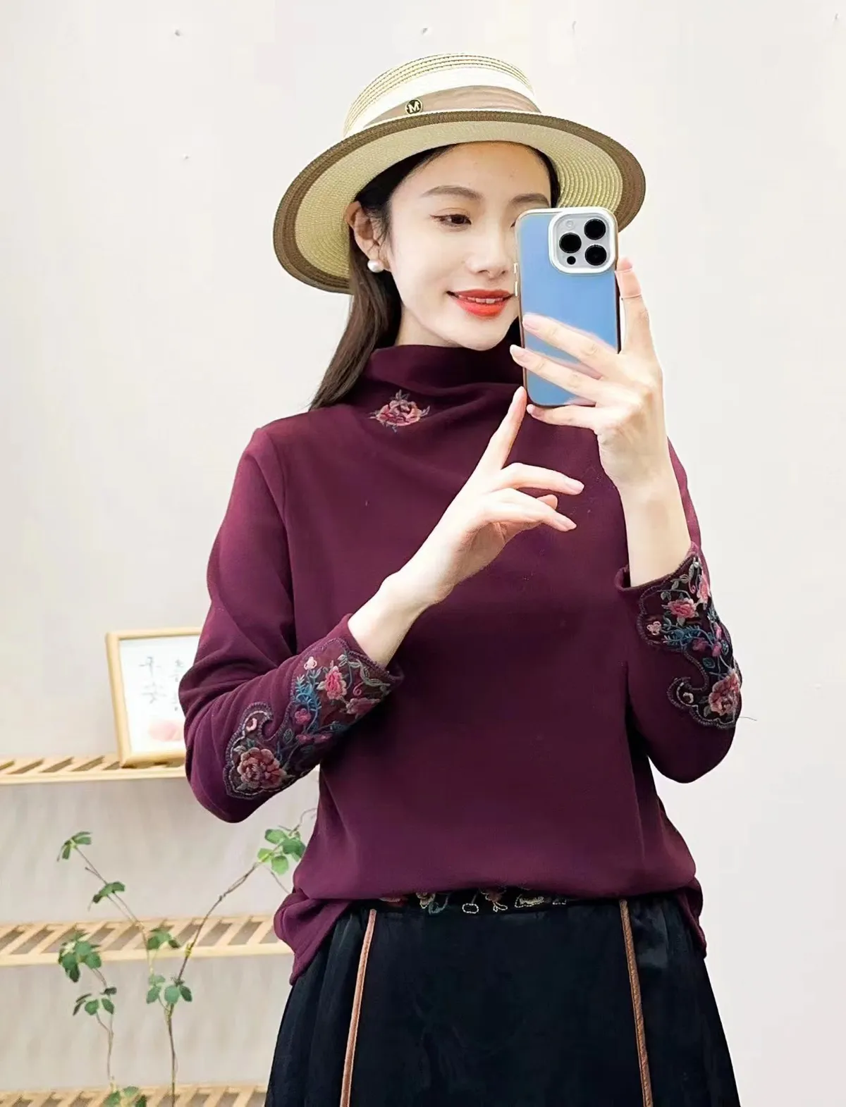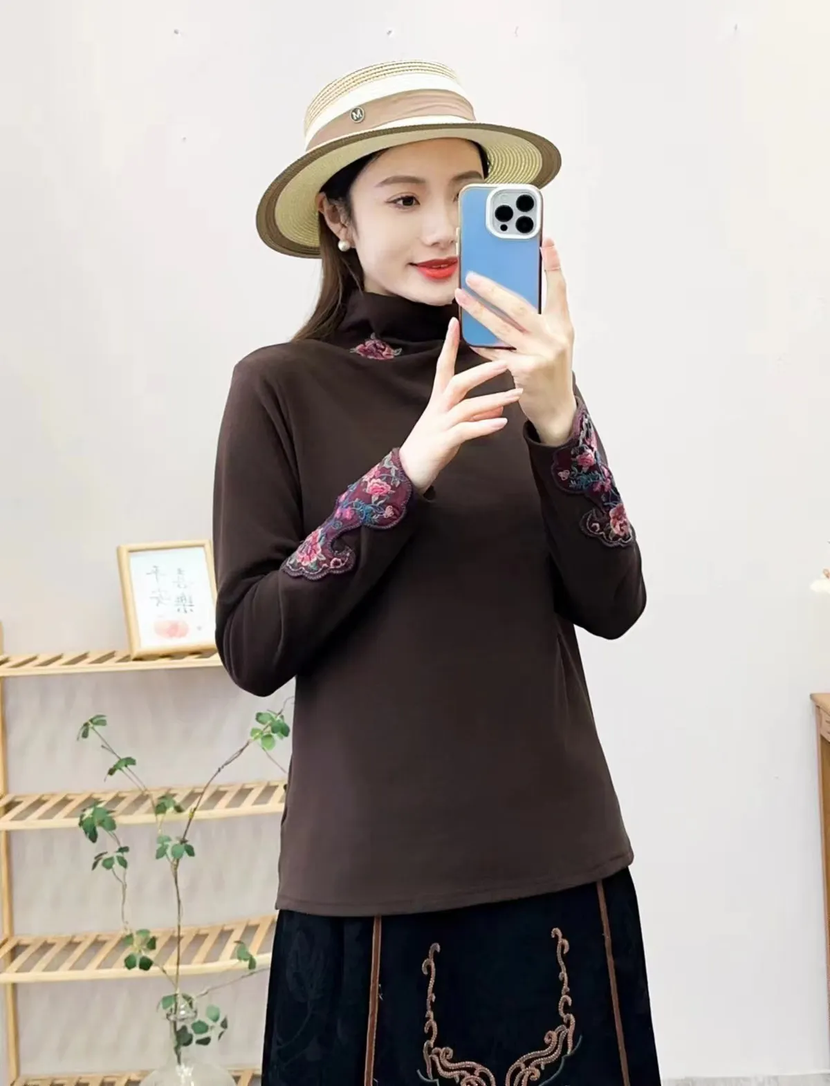 衣都精品- 2023新款加厚德絨領口袖口刺繡打底內搭上衣