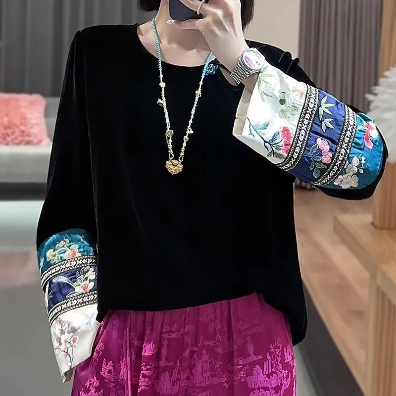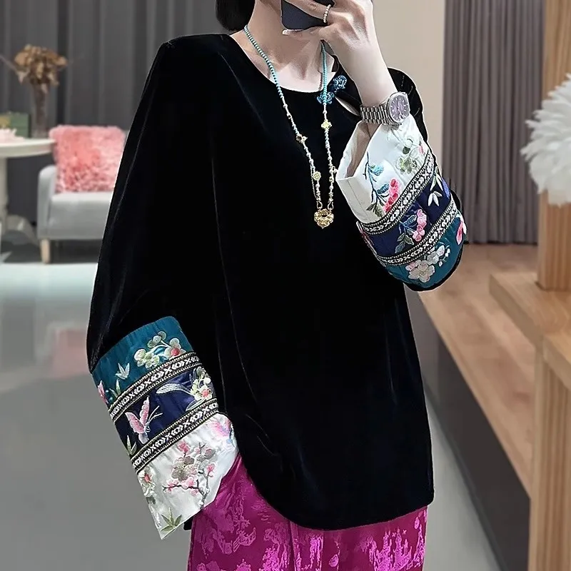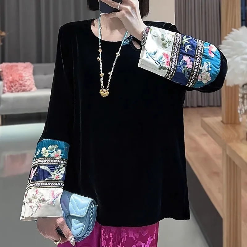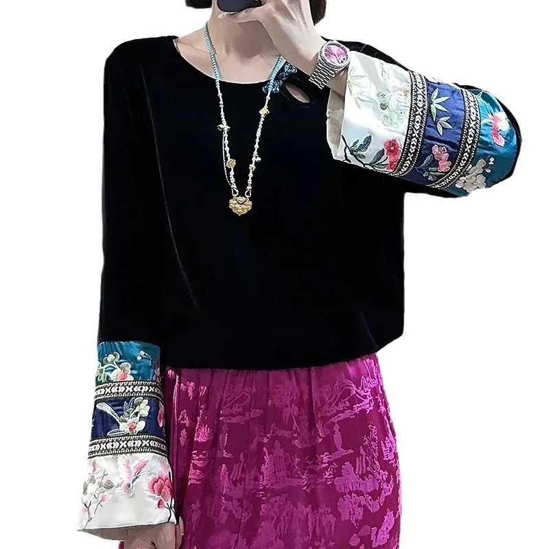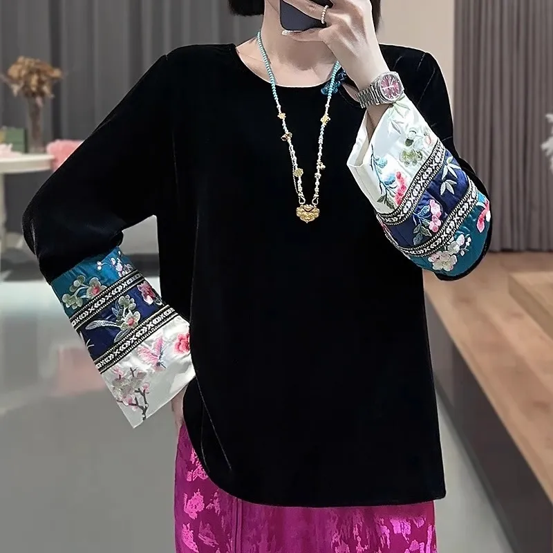 衣都精品- 2023新款民族風刺繡拼接金絲絨上衣