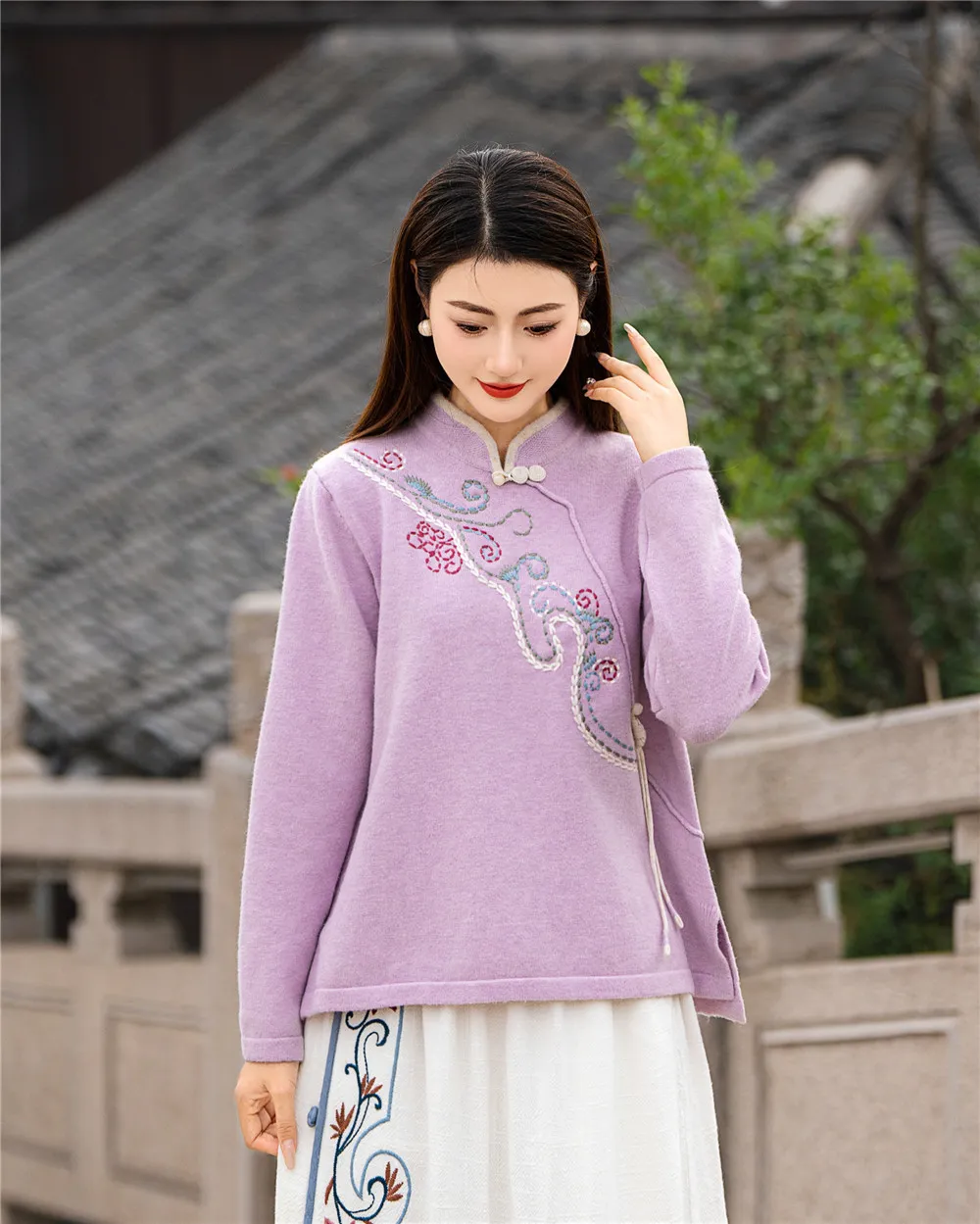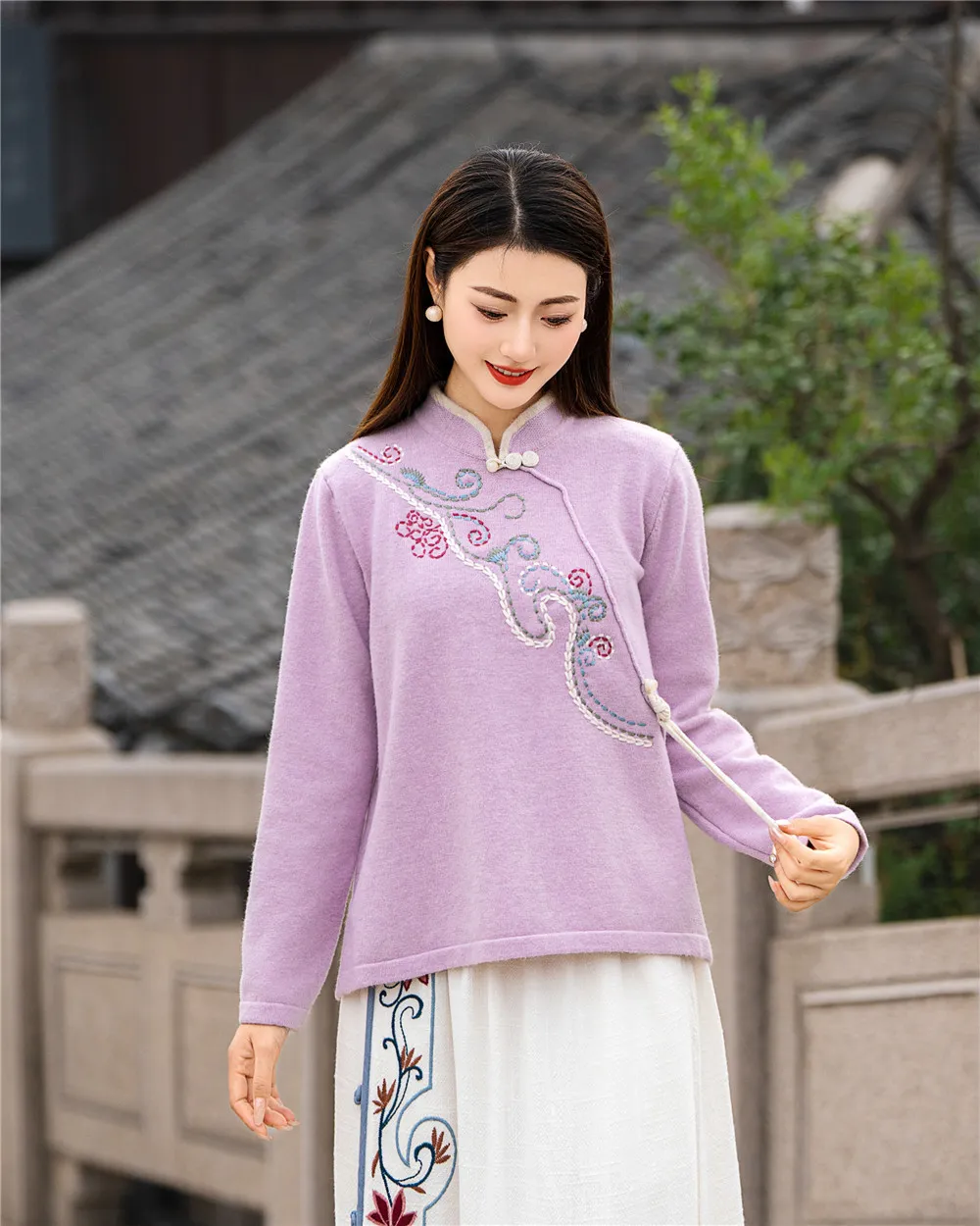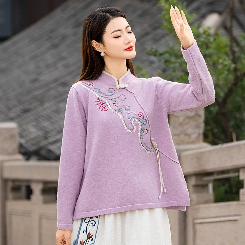 衣都精品- 2023新款純色長袖立領民族風刺繡盤扣上衣