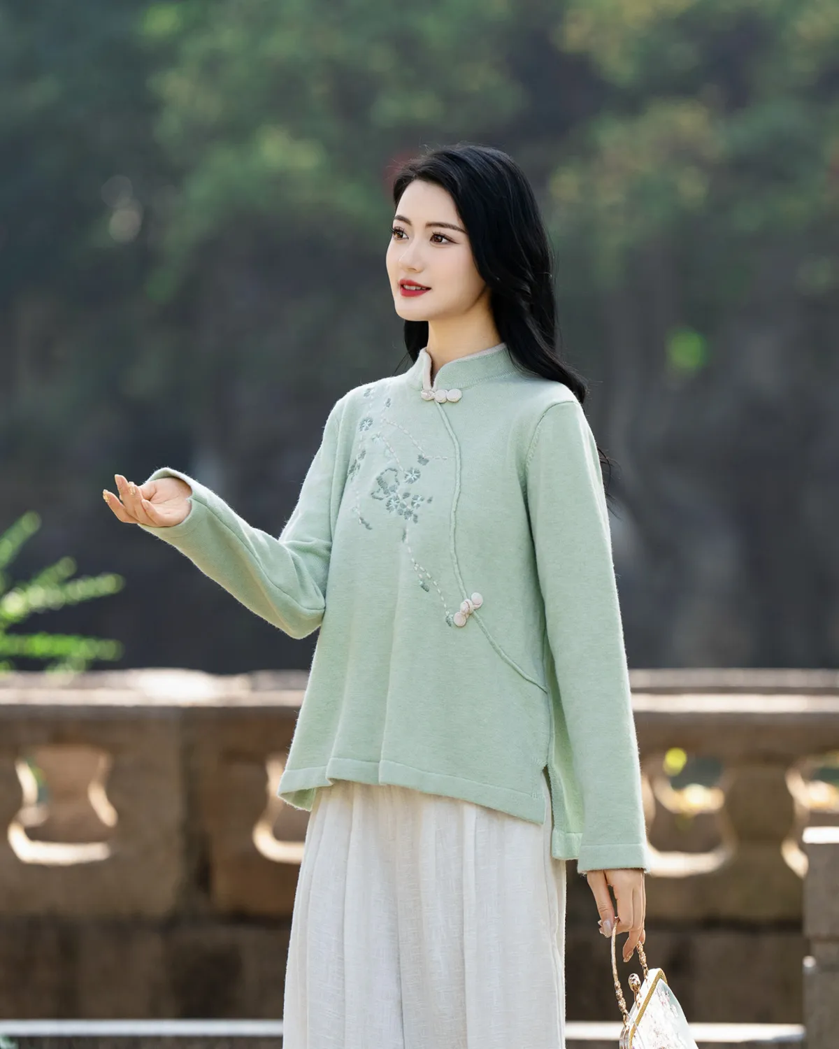 衣都精品- 2023新款純色長袖立領民族風刺繡上衣