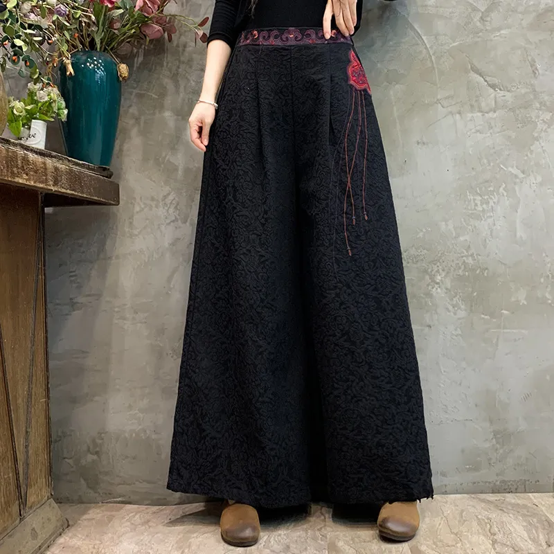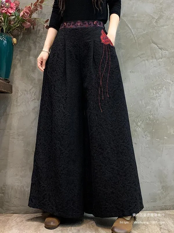 衣都精品- 2023新款民族風提花腰頭刺繡垂感闊腿褲